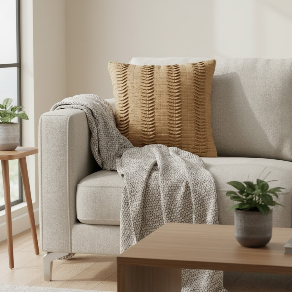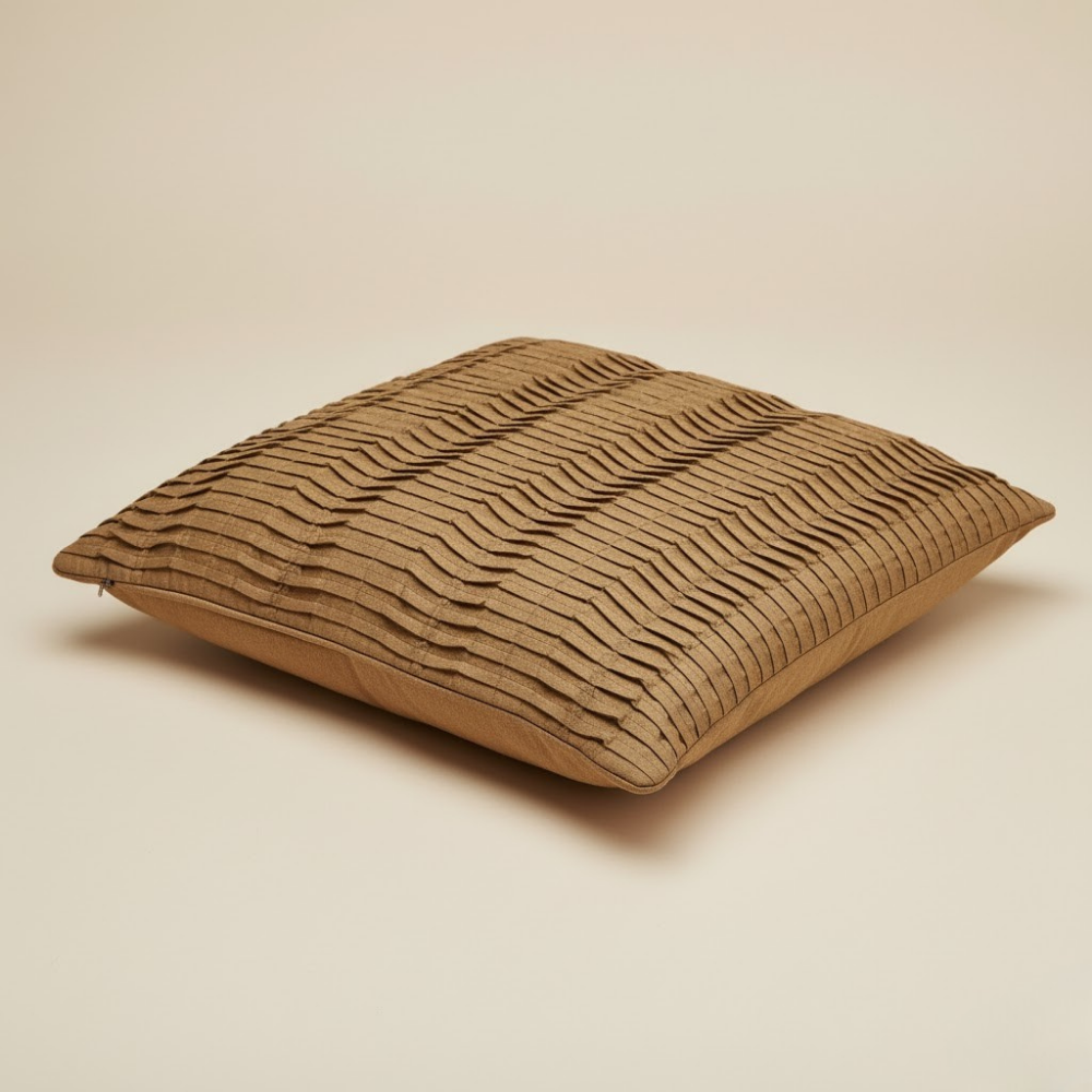 Elevate your interiors with the timeless charm of this fabric-crafted bronze cushion cover, featuring a vertical pleated texture that adds rich depth and understated luxury to your décor. Expertly made from premium poly cotton, it offers a soft, smooth touch with excellent durability — blending everyday comfort with stylish sophistication.