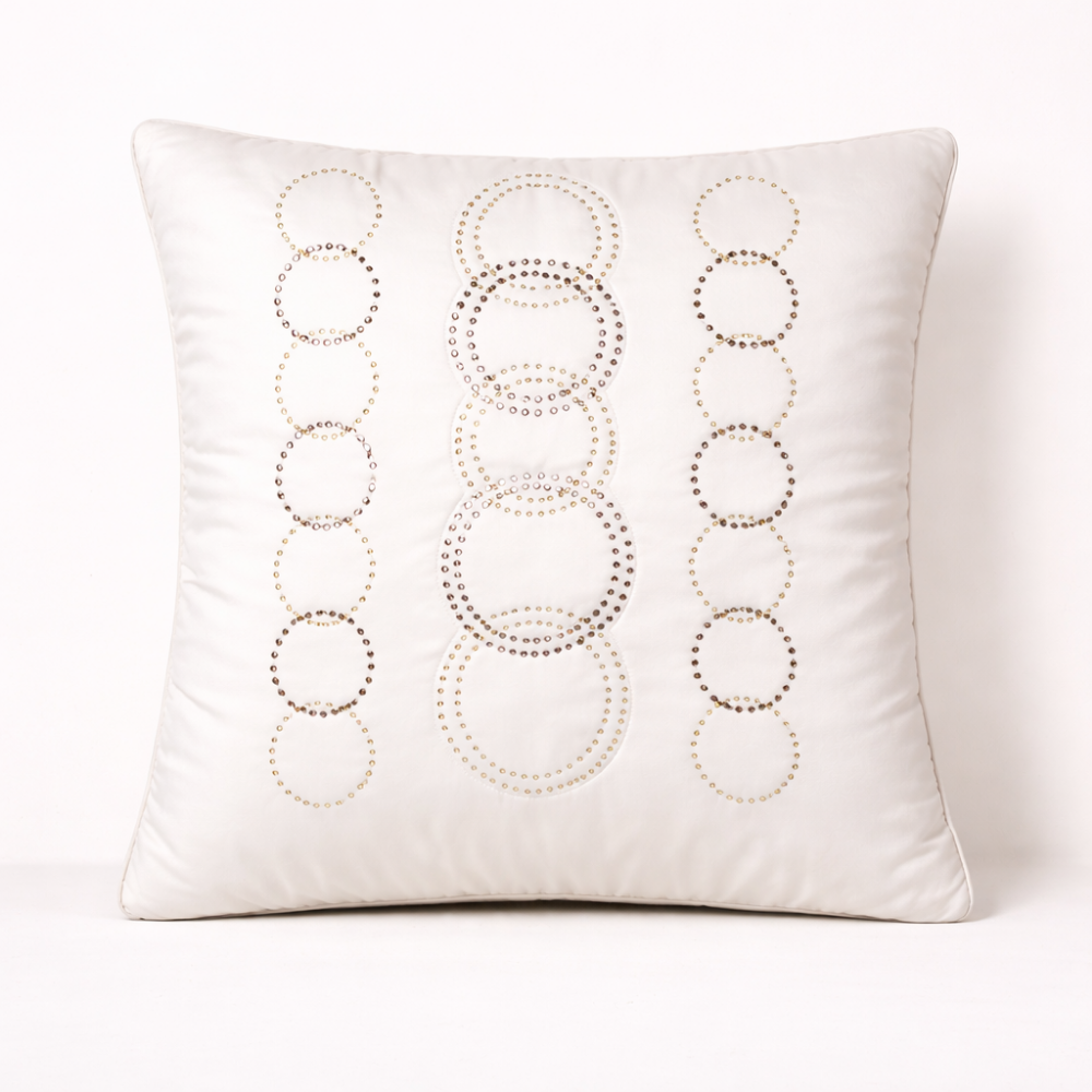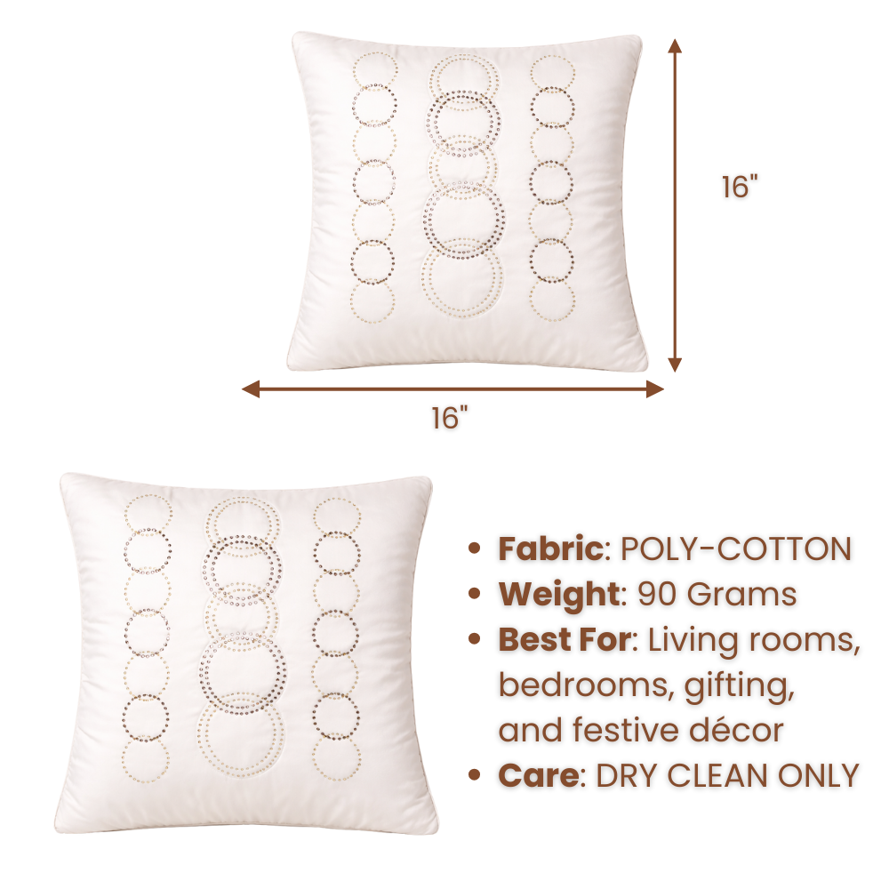 Add soft elegance and contemporary charm to your home décor with this handcrafted cream cushion cover, beautifully designed with delicate circular embellishments. The soothing cream base is enhanced with subtle metallic-toned ring patterns, creating a refined, artistic look that feels light, modern, and effortlessly luxurious.