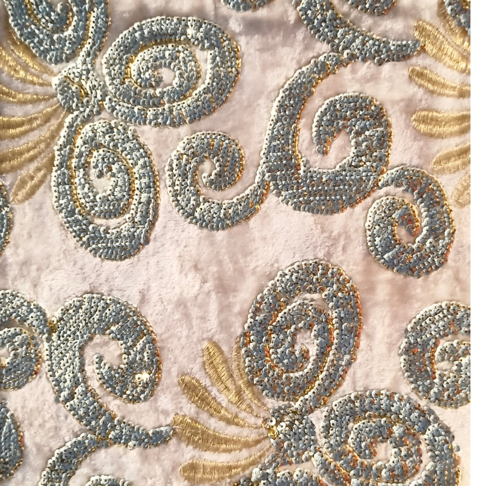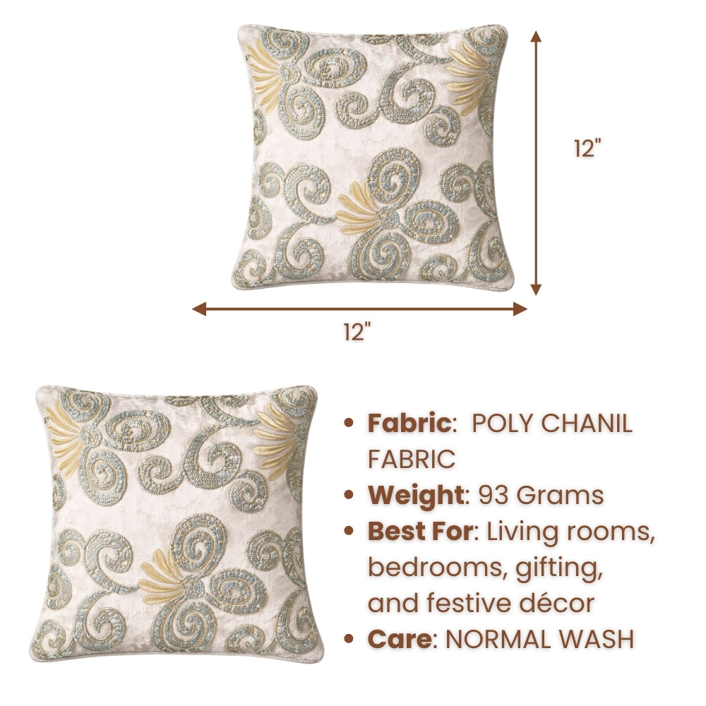 Crafted from high-quality poly chenille fabric, this cushion cover offers a plush, velvety, and ultra-soft texture, ensuring both comfort and durability. The intricate embroidered scroll pattern in soft tones adds a refined artistic charm, giving the cushion a rich and designer-inspired look.