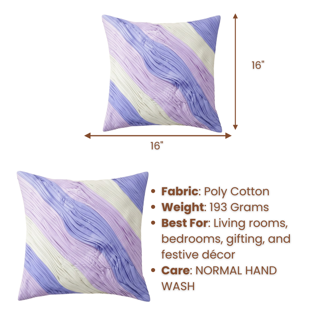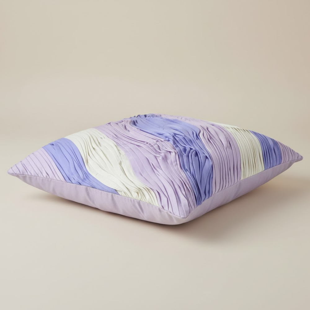 Add a soft, dreamy charm to your décor with this fabric-crafted purple cushion cover, featuring flowing pleated waves in lilac, lavender, and ivory for a soothing, pastel look. The diagonal layered pattern brings gentle movement and texture, making this 16"x16" cushion a beautiful accent on sofas, beds, and reading nooks.