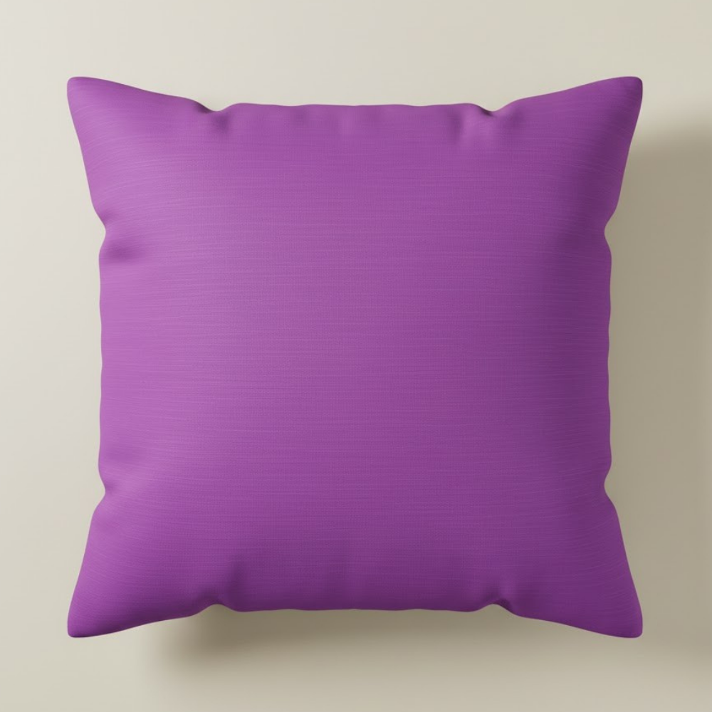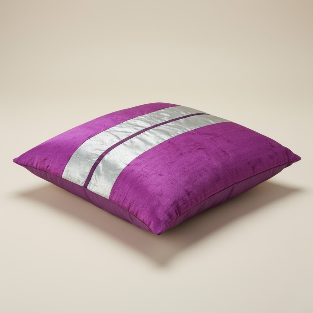 The cushion’s main hue is a captivating purple/fuchsia, complemented by two broad vertical stripes in silver or ivory, creating a striking contrast that draws the eye. A fine purple stripe between the panels adds depth and balance to the design. The overall look resembles raw silk or dupioni silk, giving it a premium and textured finish that beautifully reflects light.