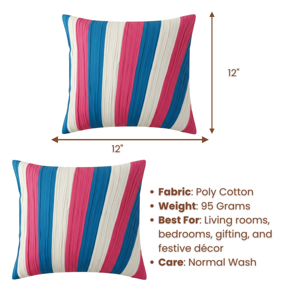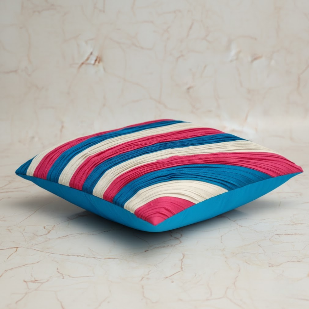 Bright, cheerful, and stylish — this fabric-crafted turquoise cushion cover features a multi-stripe textured design in vibrant shades of turquoise blue, deep pink, and cream. Made from premium poly cotton, it offers a soft, smooth feel with excellent durability, making it perfect for both everyday comfort and decorative styling.