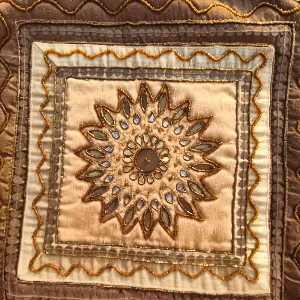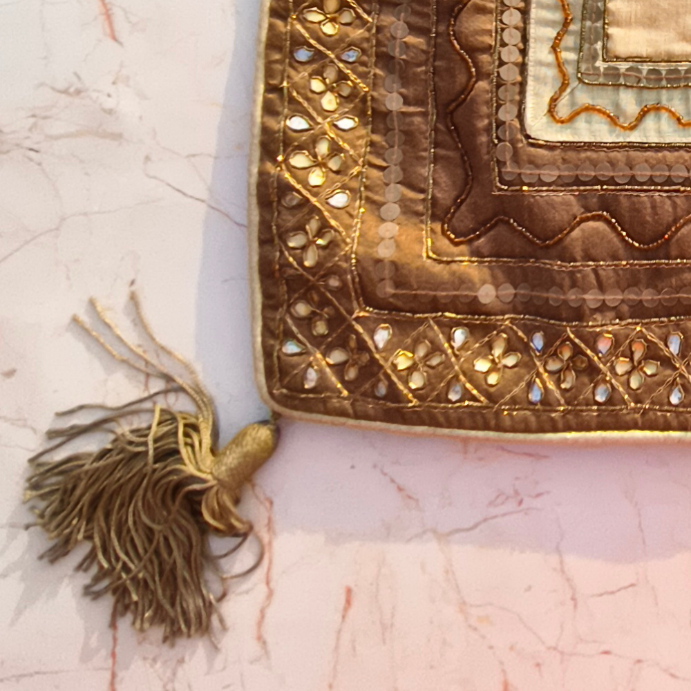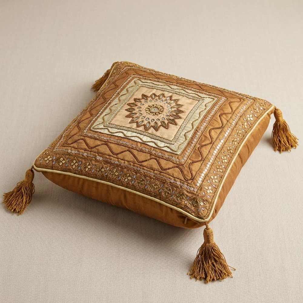 Add a rich and classic decorative touch to your home with this beautifully Hand Crafted Bronze Cushion Cover. Featuring an intricate layered embroidery pattern with a detailed central medallion design, this cushion cover reflects fine craftsmanship and timeless elegance that enhances any interior setting.