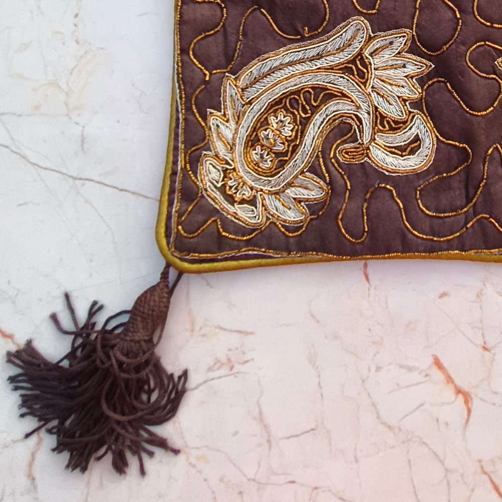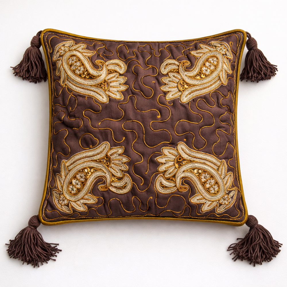Add a refined decorative touch to your home décor with this beautifully Hand Crafted Brown Cushion Cover. Designed with elegant paisley embroidery and detailed stitched patterns across the surface, this cushion cover reflects artistic craftsmanship that enhances the charm of any interior setting.