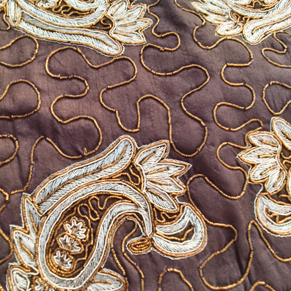 Made from high-quality poly cotton fabric, it offers durability along with a soft and smooth texture for everyday comfort. The rich brown base paired with golden embroidered paisley motifs creates a warm and sophisticated look that blends effortlessly with both traditional and modern décor styles.
