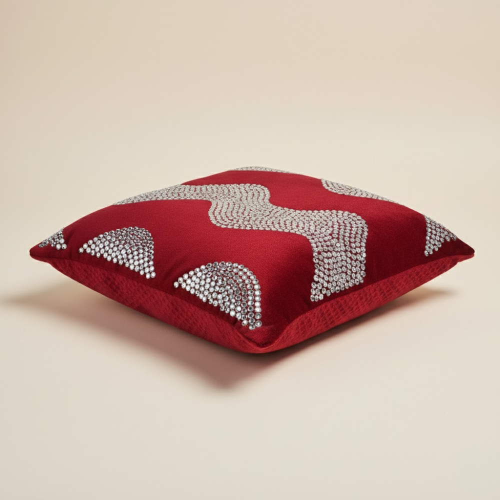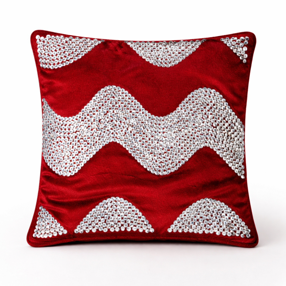 Enhance your décor with this luxurious Hand-Crafted Dark Maroon Silver cushion cover. The rich dark maroon velvet base paired with shimmering silver wave embellishments creates a bold and festive statement that instantly elevates any space.