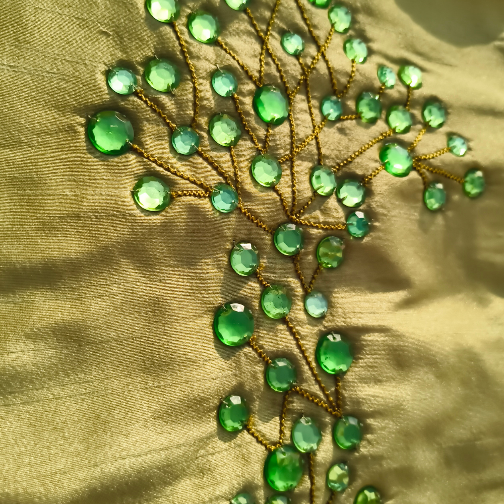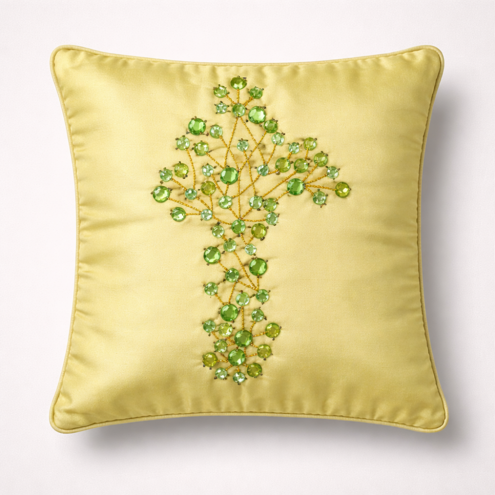 Add a refreshing and elegant accent to your home décor with this beautifully Hand Crafted Green Cushion Cover. Designed with a delicate floral branch embroidery enhanced with shimmering bead embellishments, this cushion cover creates a graceful decorative highlight that instantly elevates the look of any interior space.