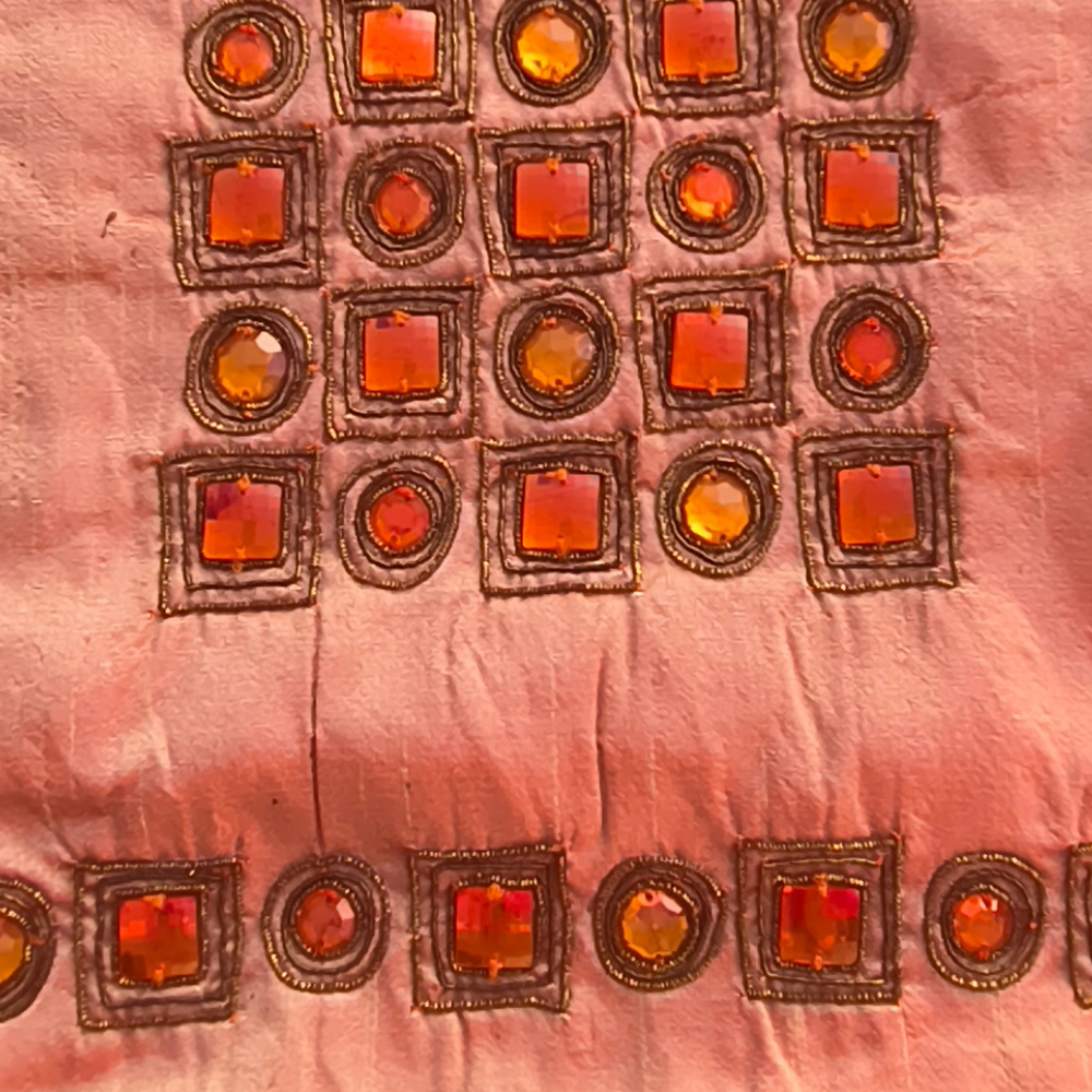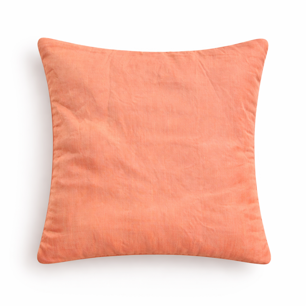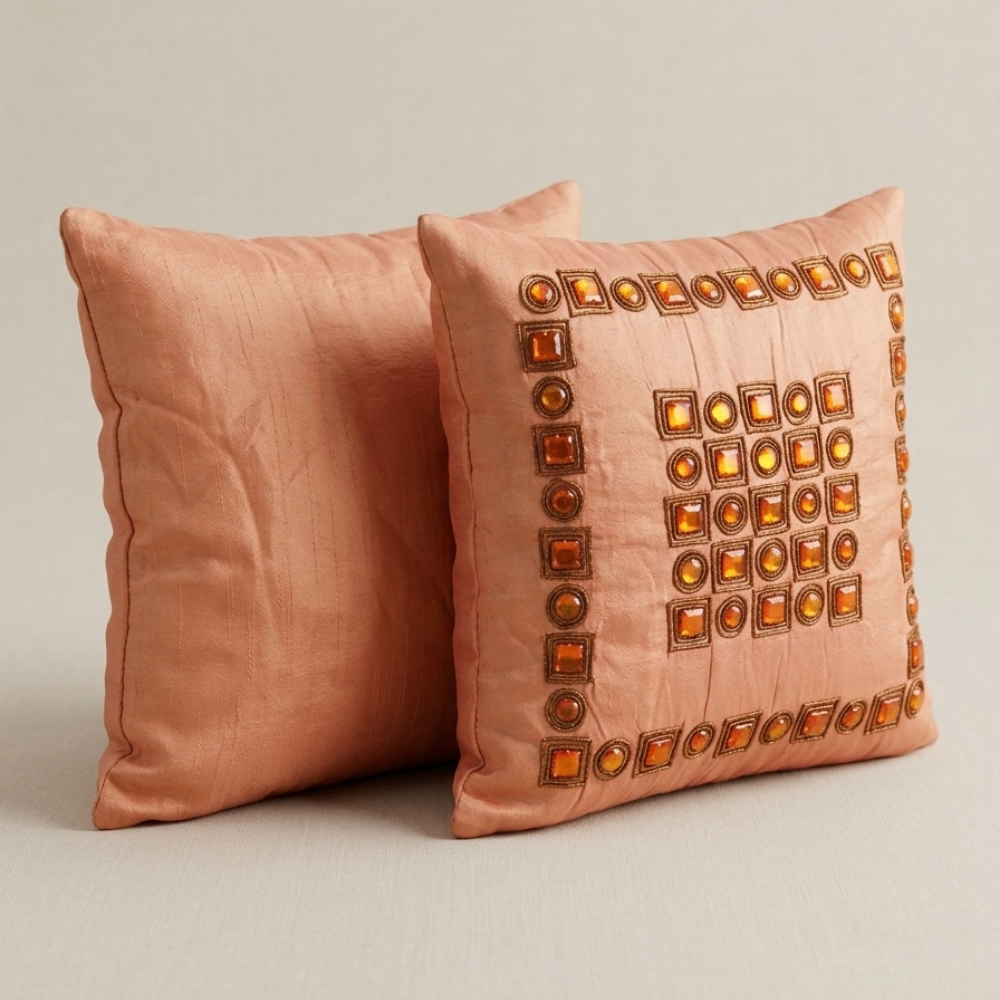Crafted from premium poly cotton fabric, this cushion cover offers durability along with a smooth and comfortable finish. The warm melon shade paired with detailed embellishments adds a refreshing and elegant touch, making it perfect for both modern and festive décor settings.
