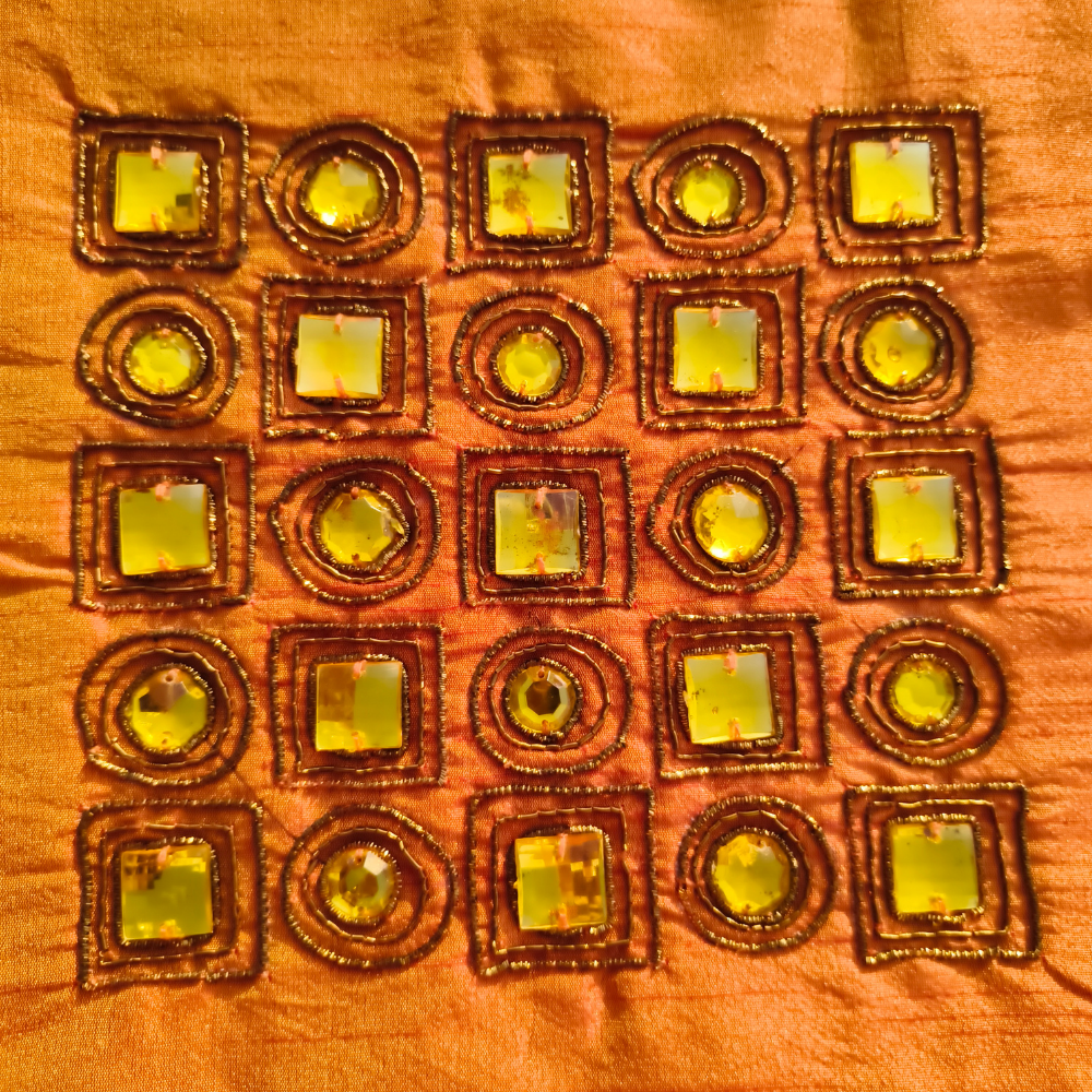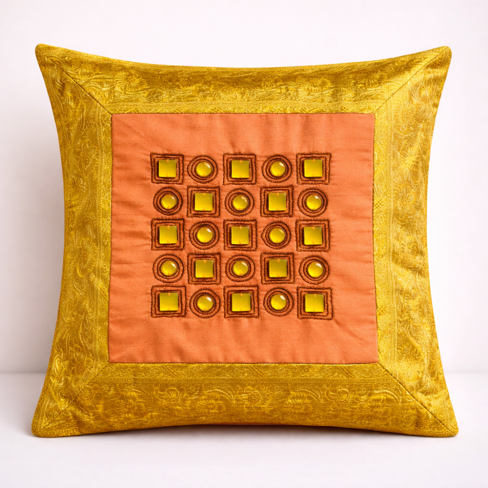 Add a vibrant and artistic touch to your home décor with this Hand Crafted Orange Cushion Cover. Featuring a beautifully framed design with a contrasting center panel and decorative geometric embellishments, it creates a bold and eye-catching accent for any interior space.