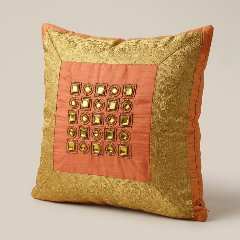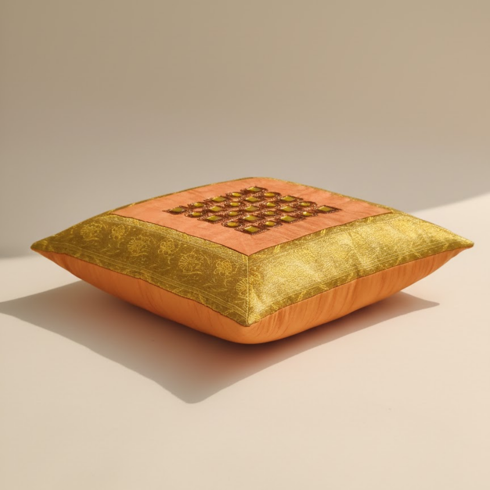 Crafted from premium poly cotton fabric, this cushion cover offers durability along with a soft and smooth finish. The warm orange tone combined with the golden border detailing gives it a festive and luxurious appeal, perfect for enhancing both modern and traditional décor settings.