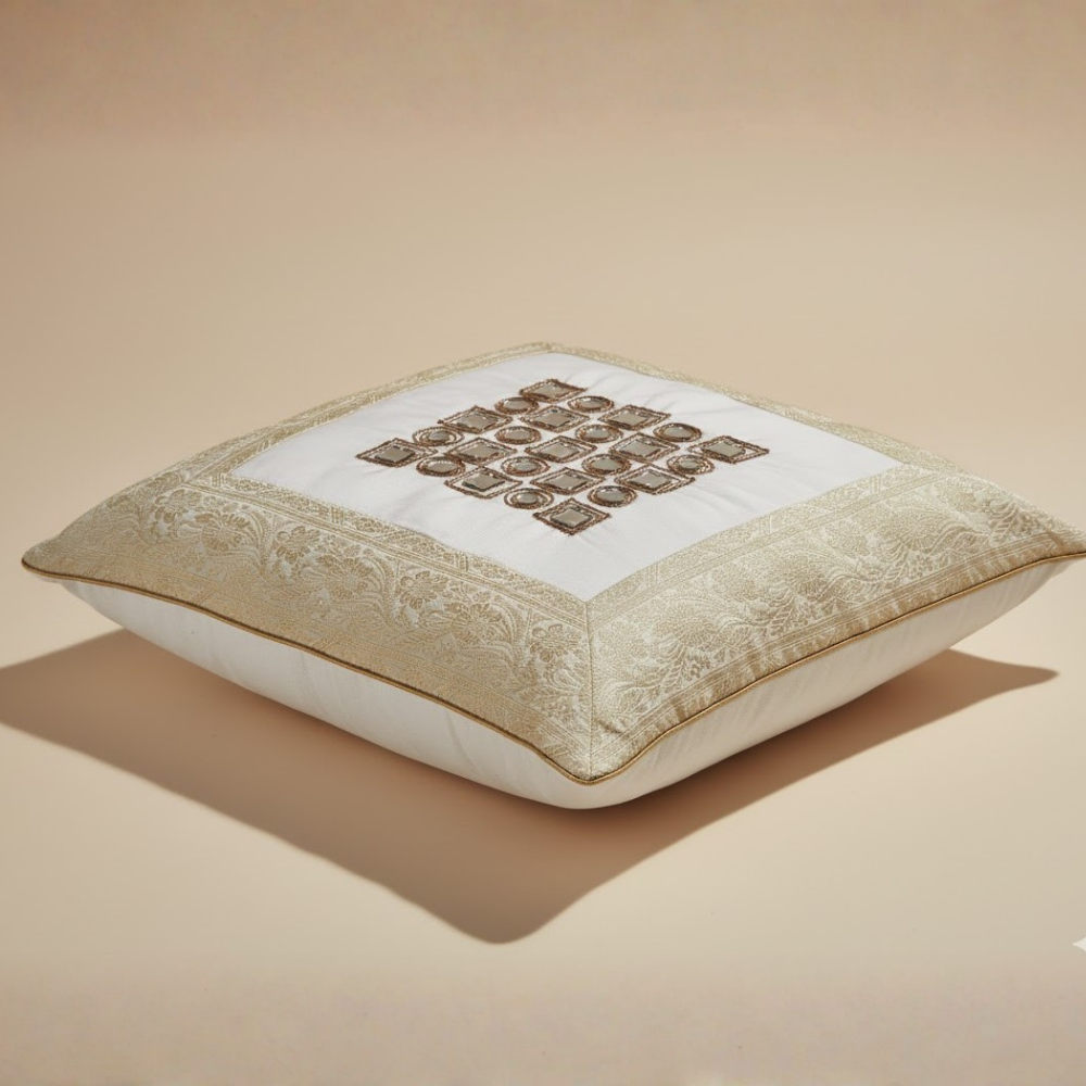 Crafted from premium poly cotton fabric, this cushion cover offers durability along with a soft and smooth finish. The graceful white shade combined with subtle golden detailing adds a luxurious and timeless charm, making it perfect for both modern and traditional décor settings.