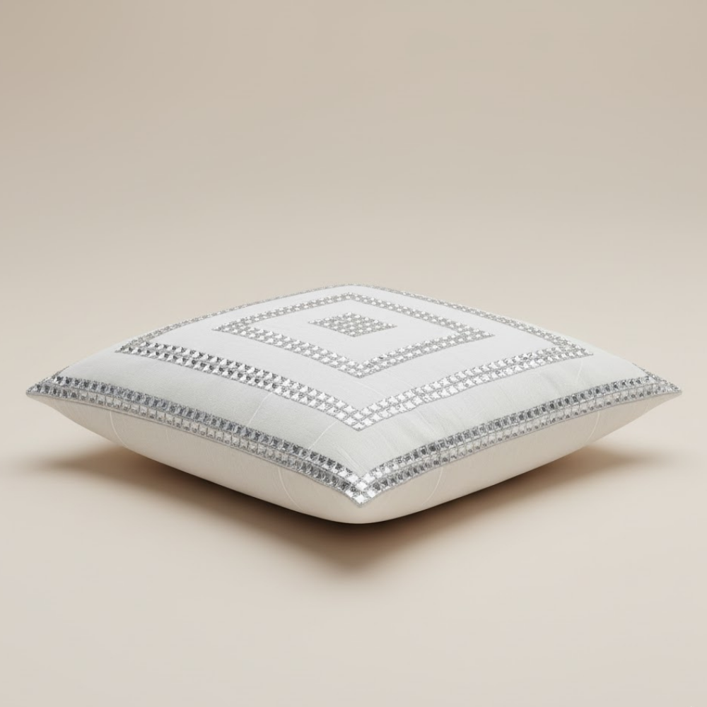 Add a touch of luxury and sophistication to your décor with this hand-crafted white cushion cover, beautifully detailed with an intricate silver square embellished pattern. Designed using premium poly cotton, it offers a soft, smooth texture with a refined, rich finish — perfect for elevating both festive and everyday interiors.