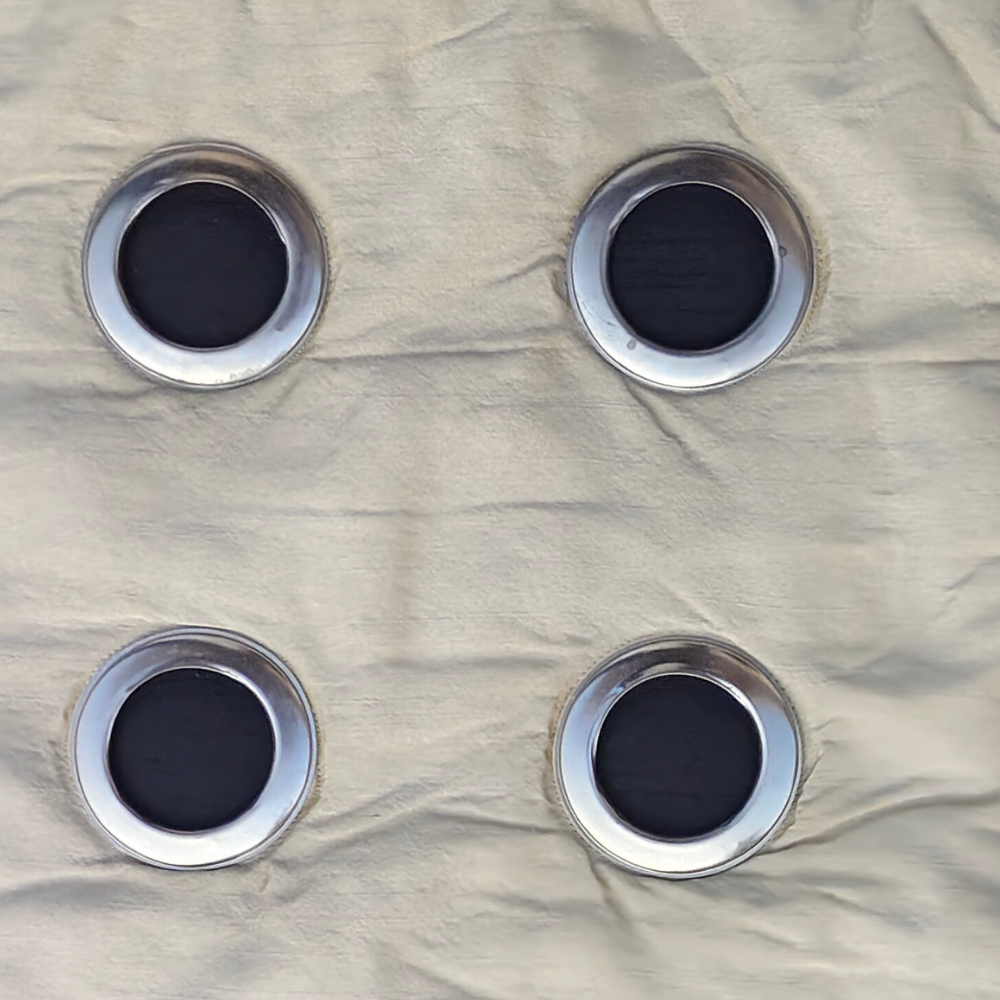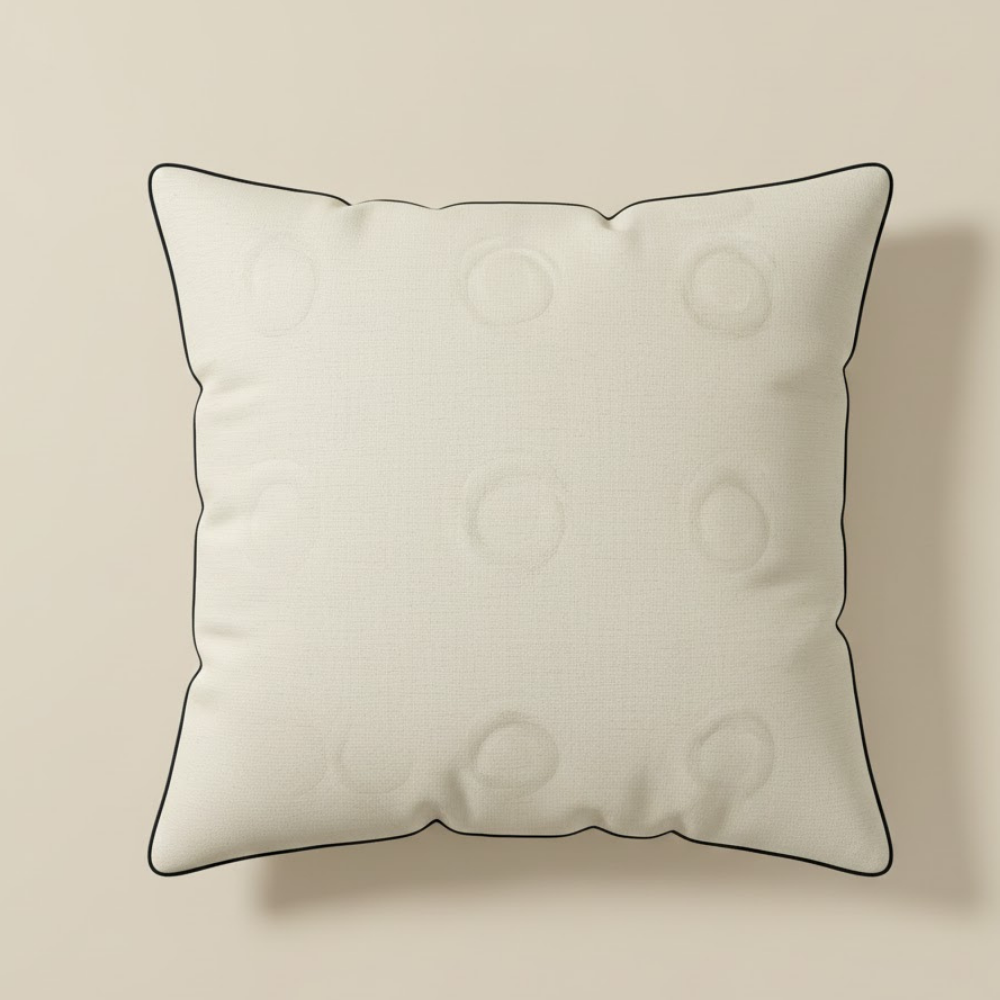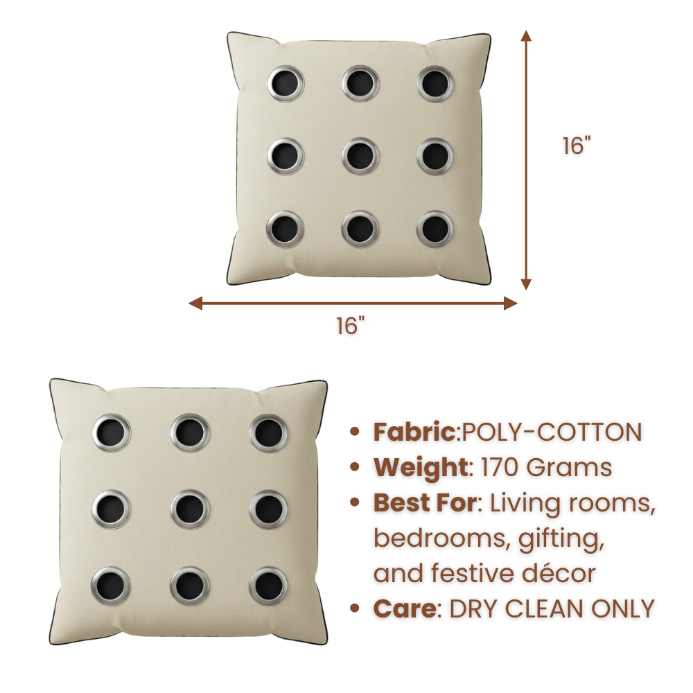 Give your décor a bold, contemporary twist with this handcrafted beige cushion cover, featuring a playful grid of metallic ring accents across the front. The soft beige base creates a warm neutral backdrop, while the circular metal details with dark centers add striking depth and a modern, sculptural look that stands out beautifully on sofas, beds, and accent chairs.