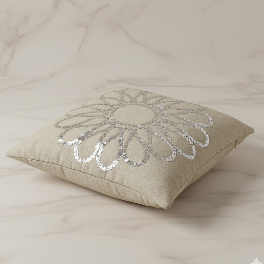 Enhance your home décor with this handcrafted beige cushion cover, beautifully designed with an intricate metallic loop pattern that adds a luxurious and festive charm. Made from high-quality poly cotton, it offers a smooth texture, elegant sheen, and long-lasting durability.