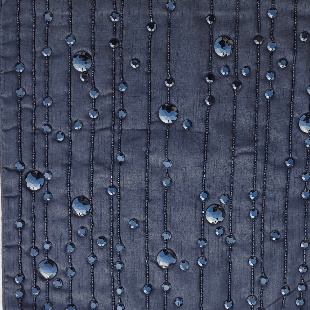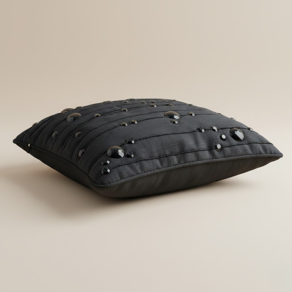 Add a bold and luxurious touch to your décor with this handcrafted black cushion cover, beautifully detailed with sparkling bead embellishments and elegant vertical thread work. The deep black base creates a striking backdrop that highlights the shimmering handcrafted accents, making it a perfect statement piece for modern, festive, or premium interiors.