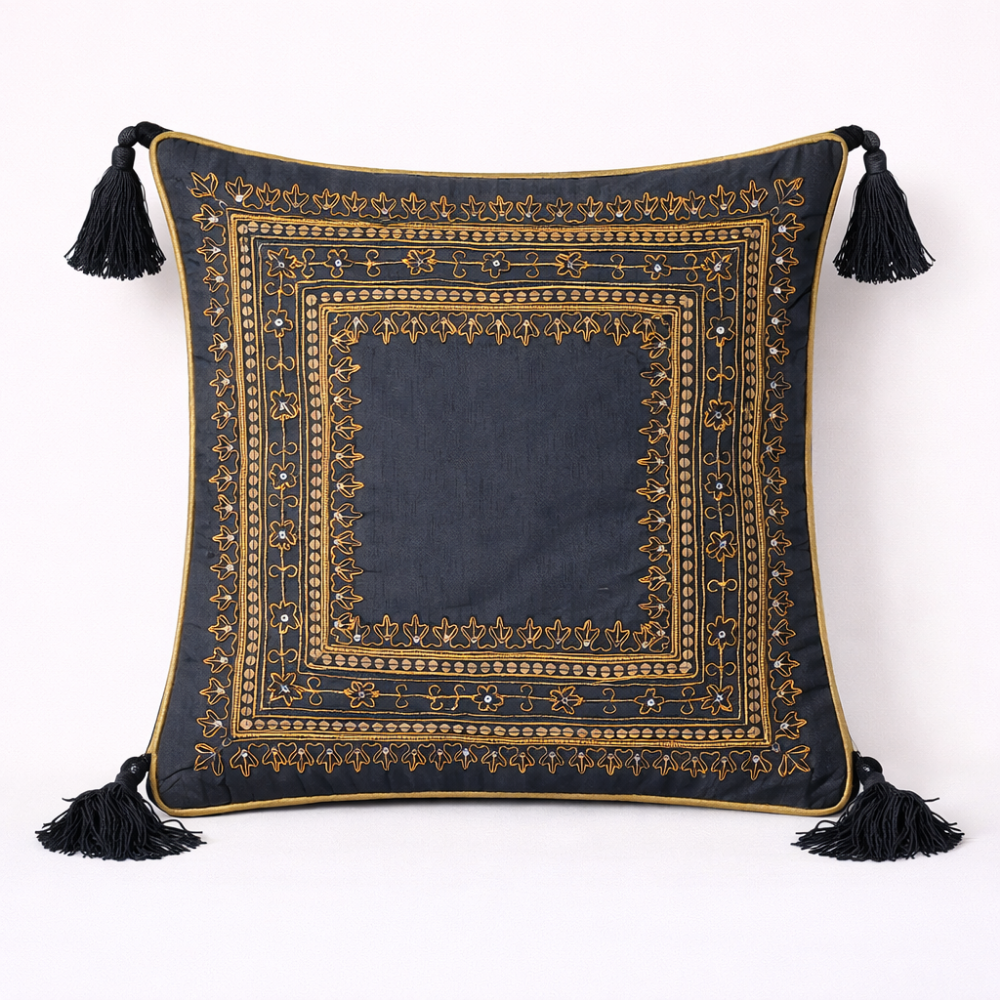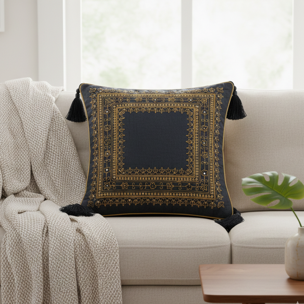Add timeless sophistication to your home décor with this handcrafted black cushion cover, elegantly designed with intricate square border embroidery. The deep black base is beautifully highlighted with detailed golden threadwork in a layered square pattern, creating a rich, regal look that blends effortlessly with both classic and contemporary interiors.