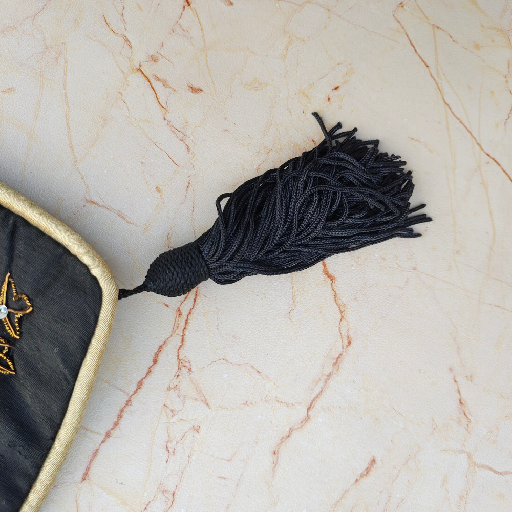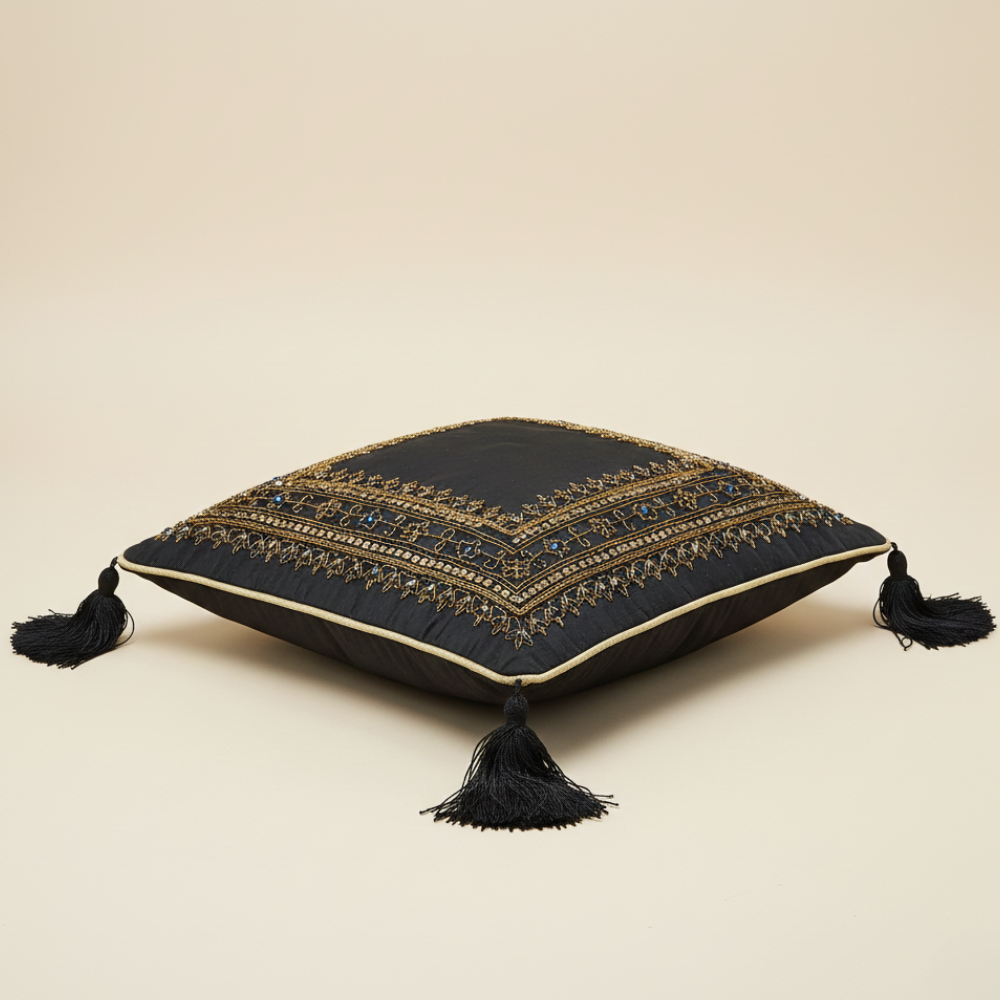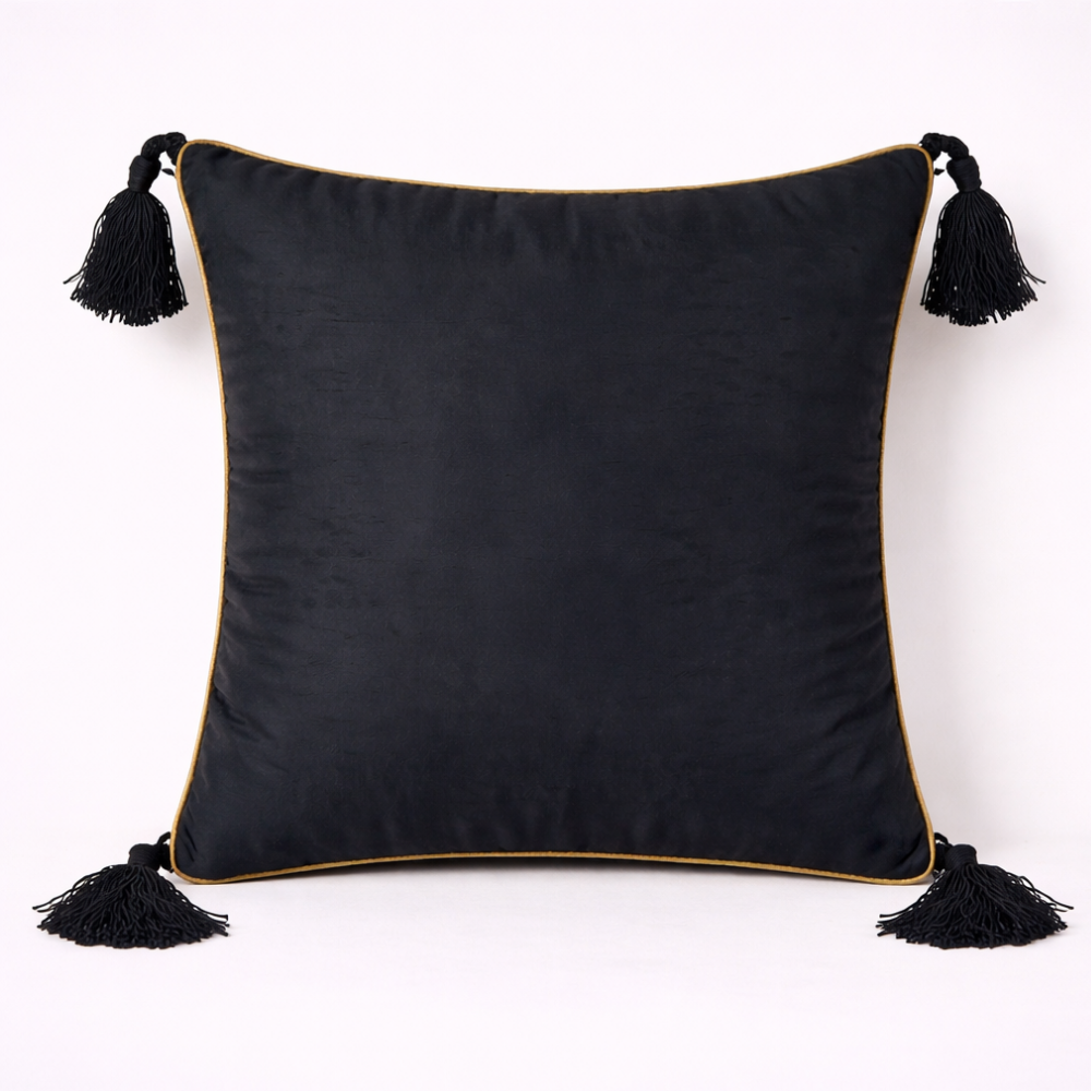 The finely handcrafted embroidery adds depth and artisanal texture, while matching black tassels on all four corners lend a refined festive touch. Its generous 16"x16" size makes it ideal for sofas, lounge seating, beds, or statement décor arrangements, instantly elevating the ambiance of your space.