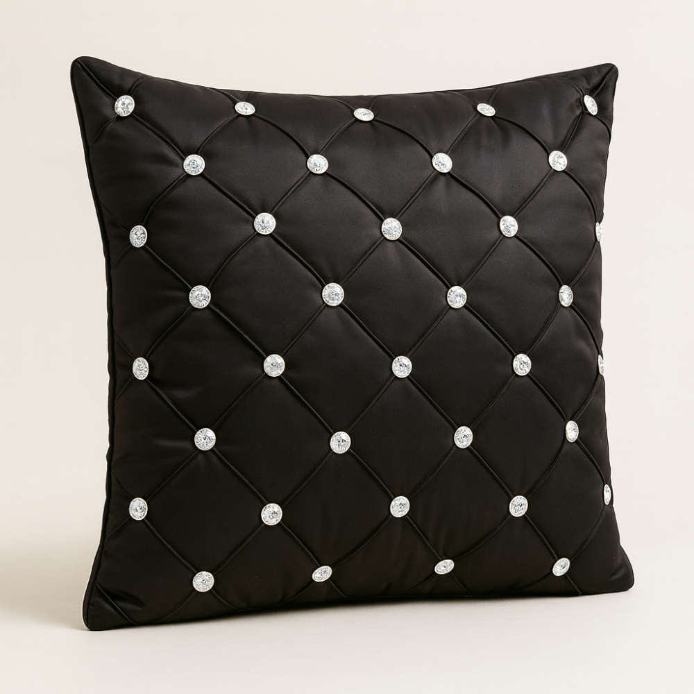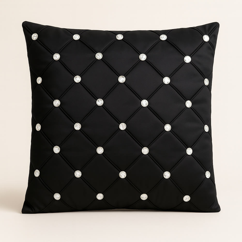 Add a touch of bold sophistication to your home with this handcrafted black cushion cover, designed to elevate any space with its striking elegance. The deep black base gives a sleek, modern look, while the diamond-quilted stitching paired with sparkling crystal embellishments creates a luxurious, high-end finish.