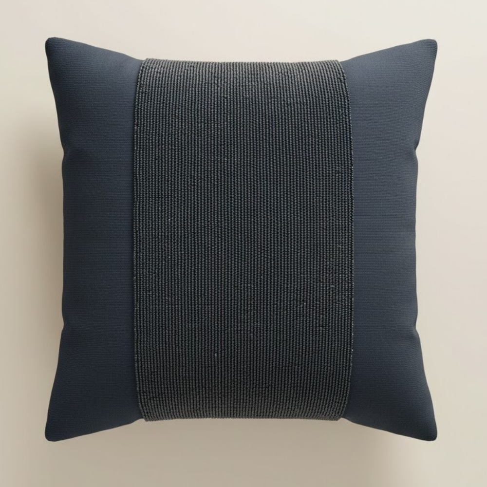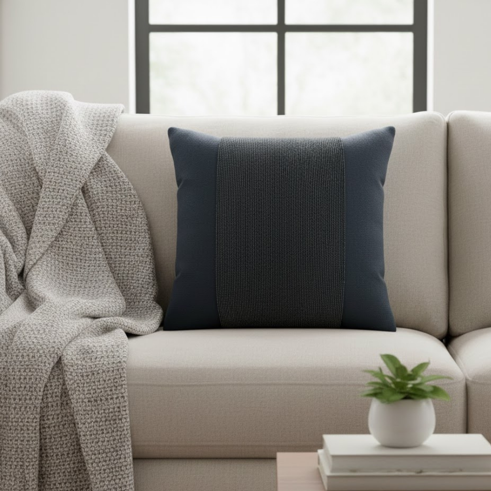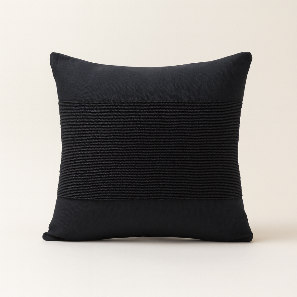 Introduce timeless sophistication to your space with this handcrafted black cushion cover, perfect for creating a sleek, modern focal point on sofas, beds, and accent chairs. The deep black base is enhanced by a broad central textured stripe, adding subtle pattern and dimension while maintaining a clean, minimalist aesthetic.