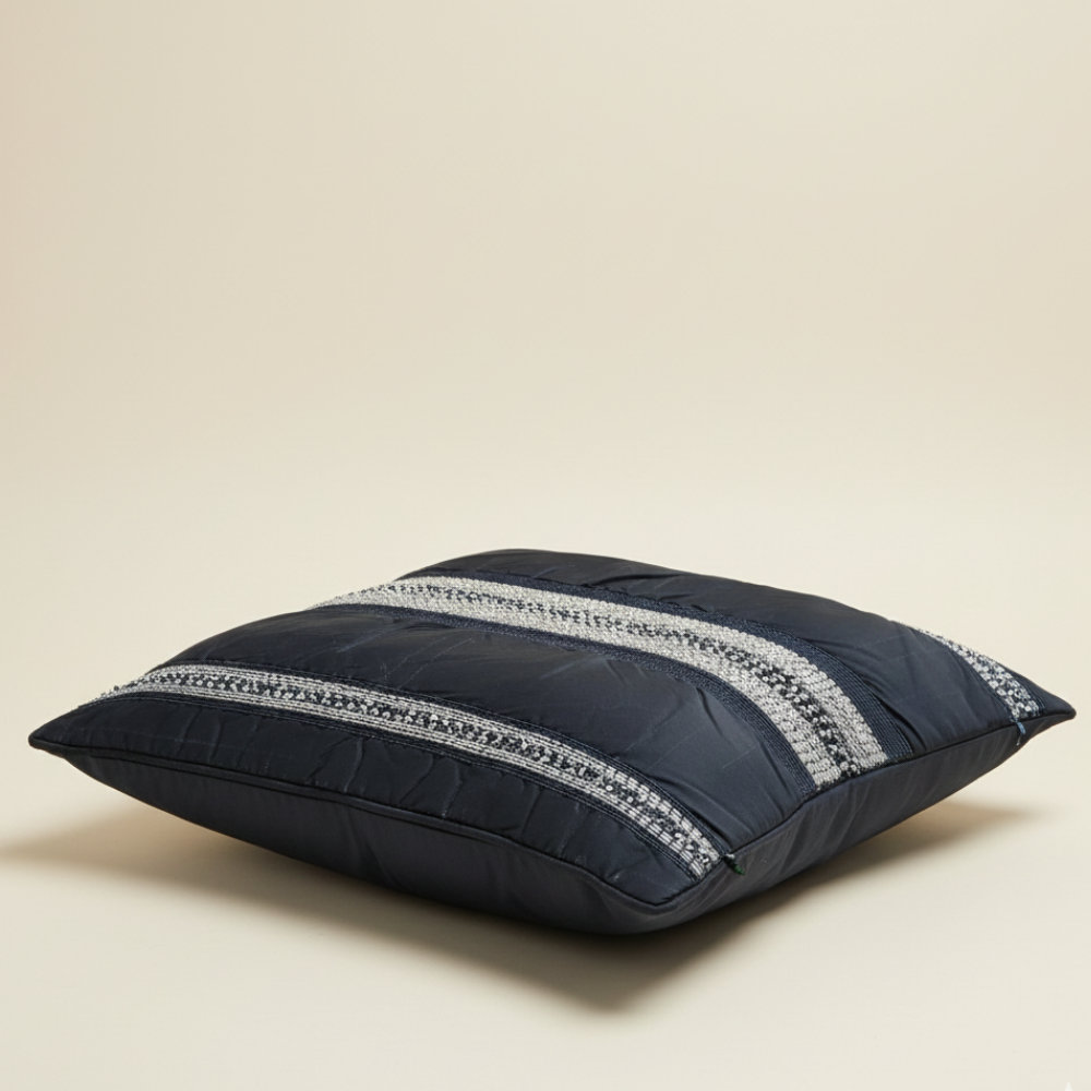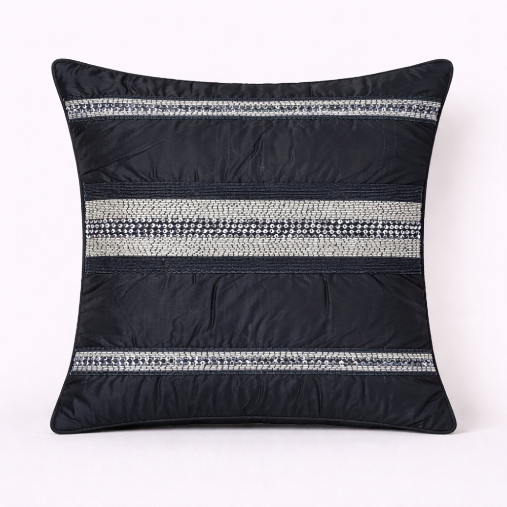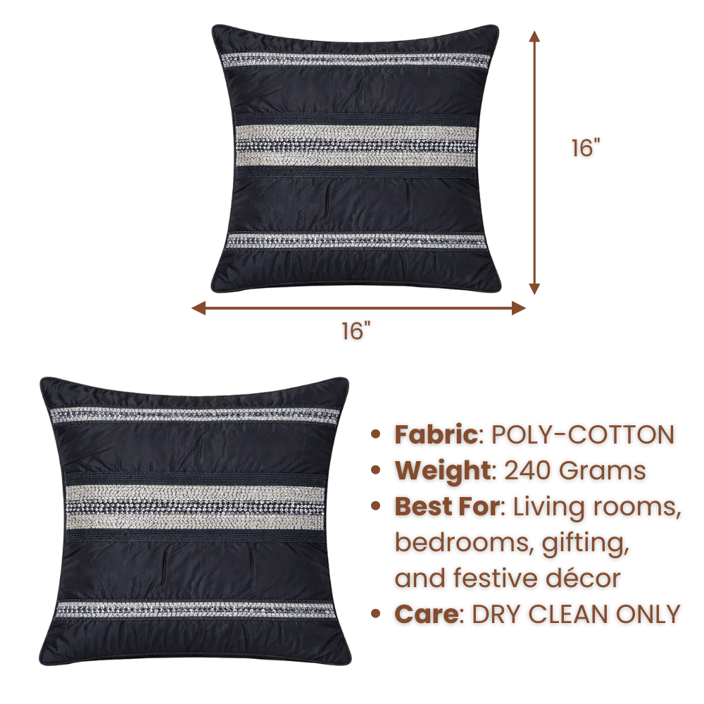Add bold sophistication and modern elegance to your home décor with this handcrafted black cushion cover, beautifully accented with refined horizontal striped embellishments. The deep black base is enhanced with subtle metallic-toned woven bands, creating a striking contrast that feels luxurious, contemporary, and timeless.