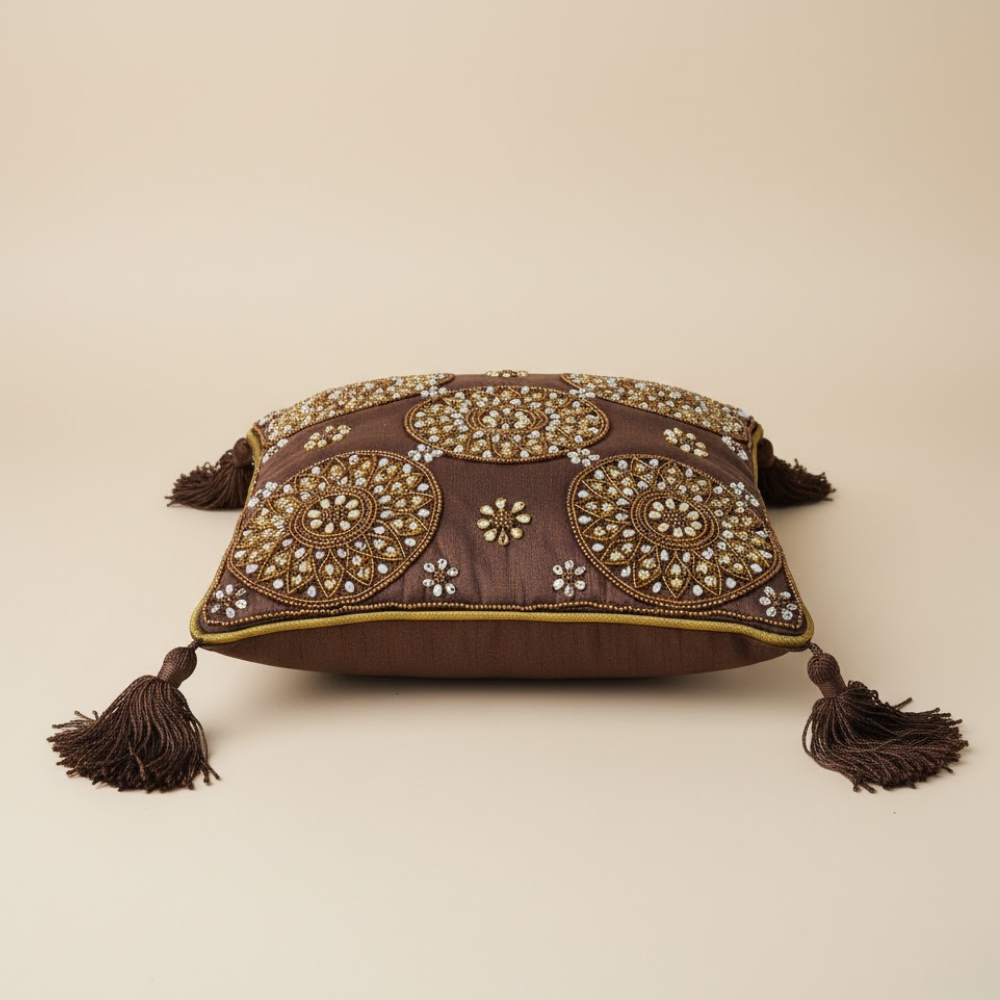 Bring a warm and sophisticated charm to your living space with this handcrafted brown cushion cover, made from premium poly cotton for a soft, durable, and elegant finish. The earthy brown tone adds depth and coziness, making it a perfect accent for sofas, beds, and lounge chairs. Designed in a compact 12"x12" size and weighing 75 grams, it is lightweight yet premium, offering comfort and easy styling. Its smooth texture and fine handcrafted detailing ensure long-lasting quality and timeless appeal. Ideal for both modern and traditional interiors, this cushion cover enhances your décor with a subtle, natural elegance. Dry clean only care is recommended to maintain its refined look and finish.