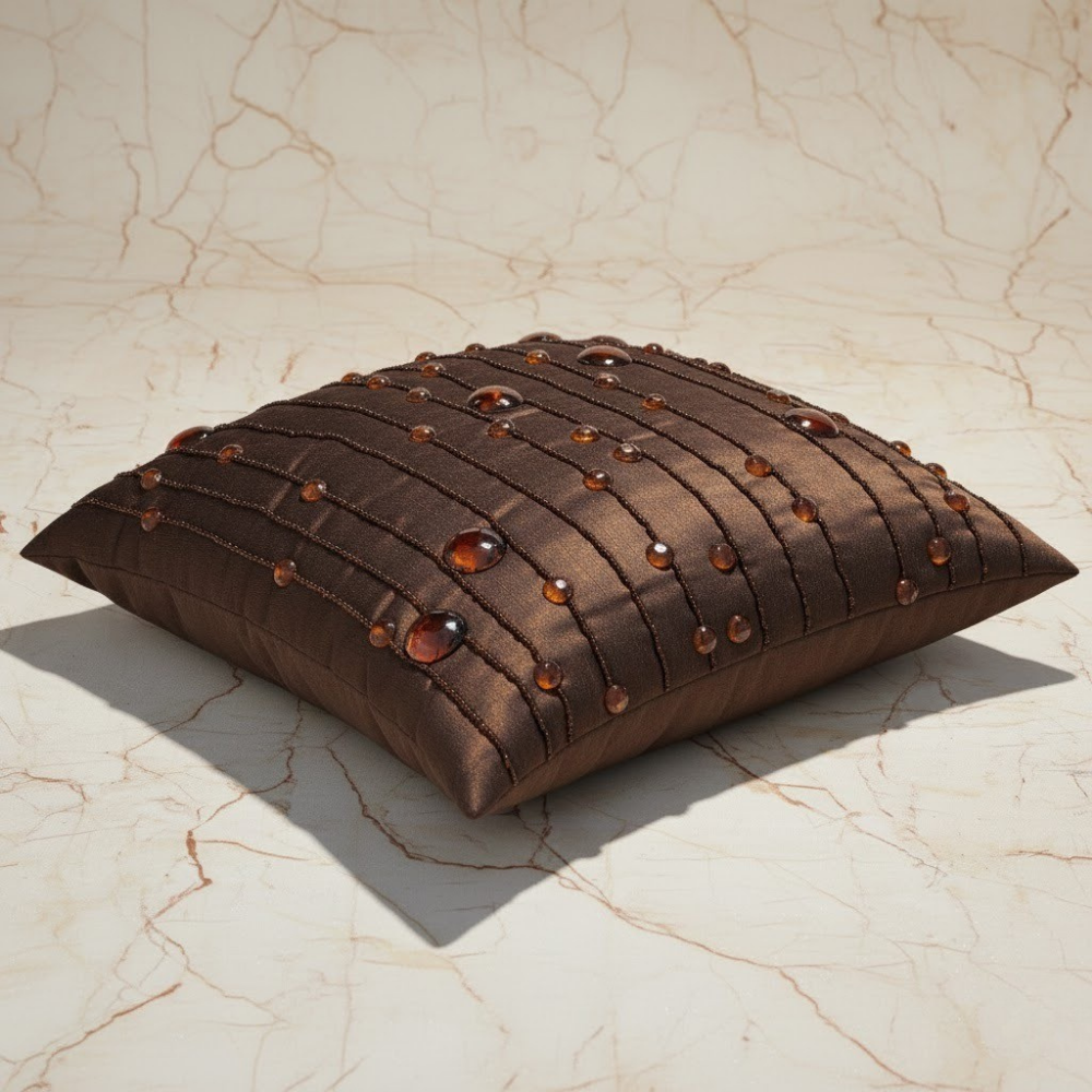 Add a luxurious artisanal charm to your home décor with this beautifully handcrafted brown cushion cover. Designed with intricate bead embellishments and detailed vertical threadwork, it brings a rich, festive elegance to any setting. The deep brown shade enhances the handcrafted accents, creating a warm and sophisticated visual appeal.