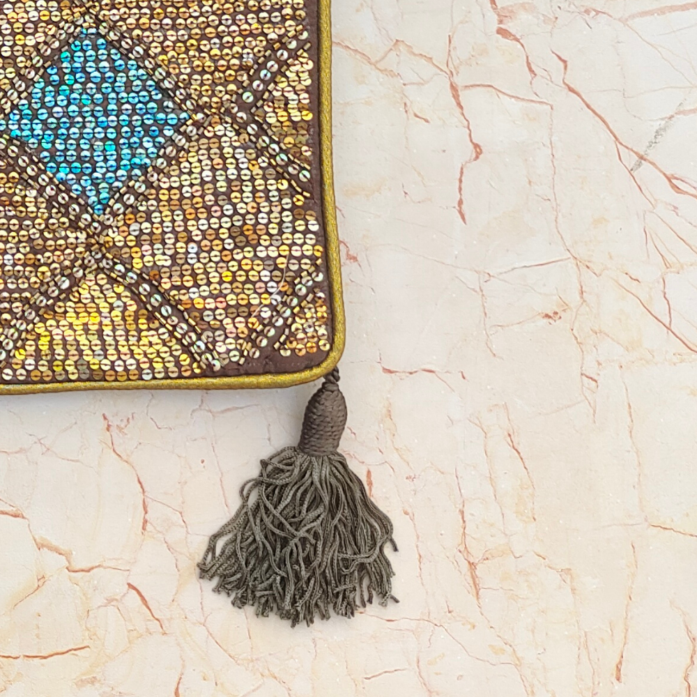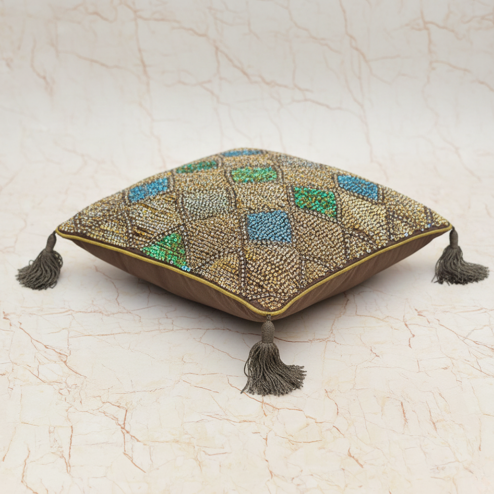 Bring earthy luxury and artisanal charm into your living space with this exquisite handcrafted brown cushion cover. Designed with a detailed diamond patchwork embroidery, this piece features a harmonious blend of warm brown tones accented with vibrant hints of turquoise, green, mustard, and subtle beige—creating a beautifully balanced, jewel-inspired look.