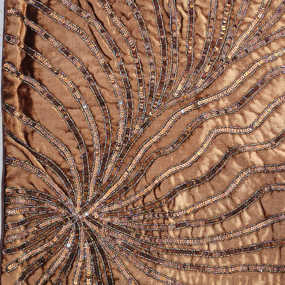 Infuse your home with rich, warm elegance using this handcrafted brown cushion cover, perfect for adding a luxurious shimmer to sofas, beds, and accent chairs. The deep brown base is artistically embellished with radiant swirl patterns made of sequins and threadwork, creating a flowing, light-catching design that feels both festive and sophisticated.