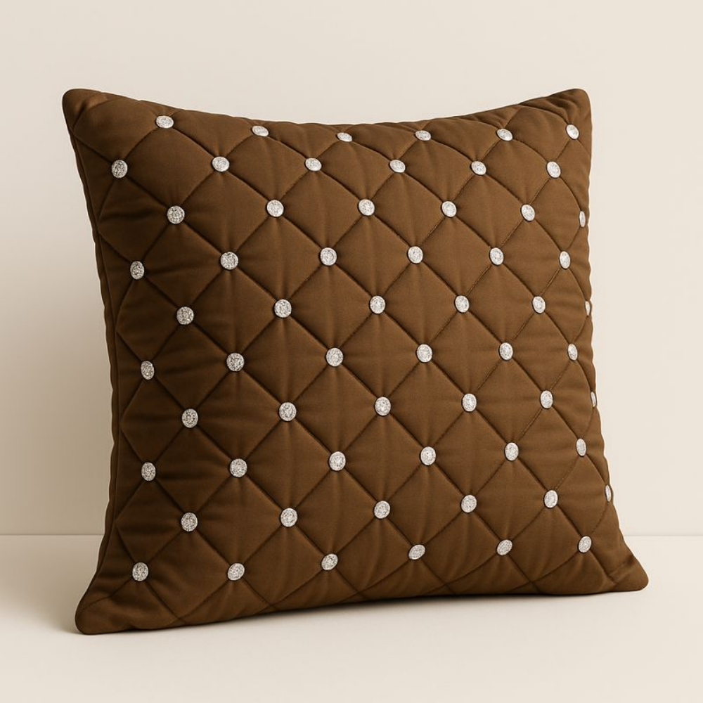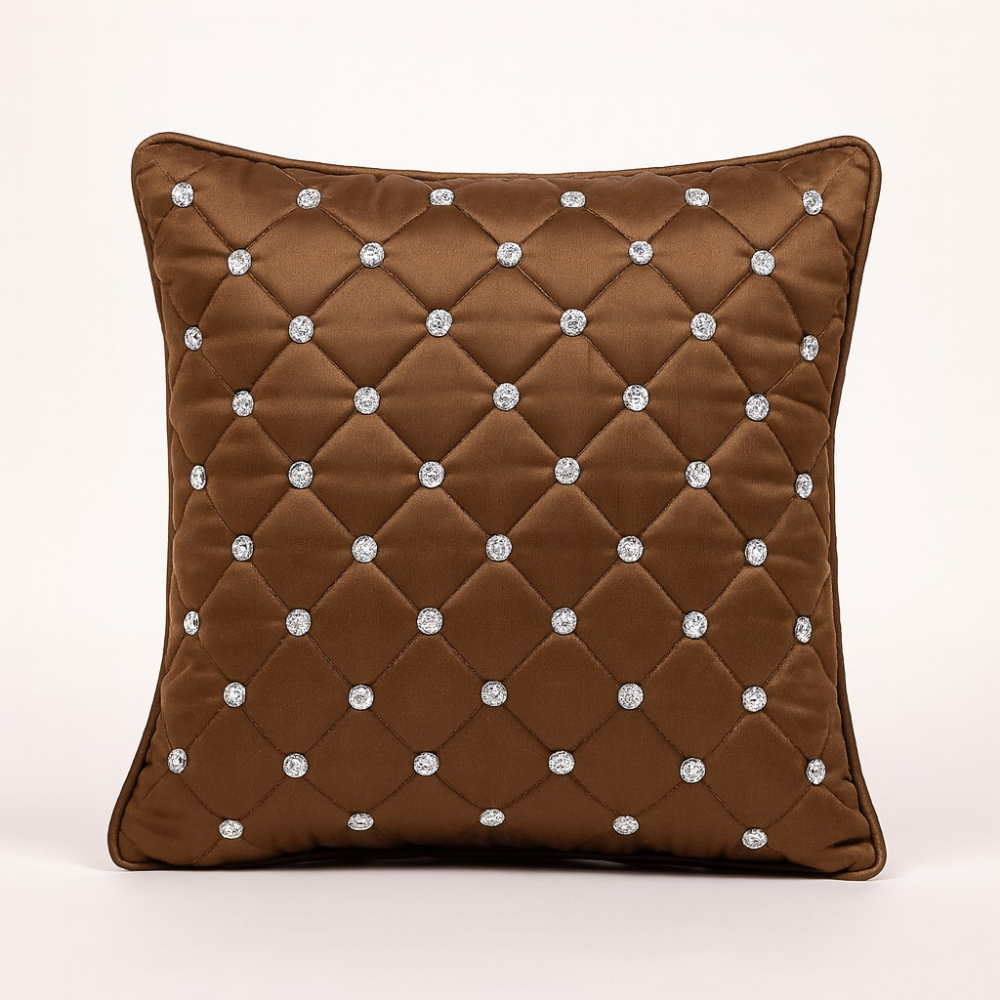 Bring warmth and timeless elegance to your interiors with this beautifully handcrafted brown cushion cover. The deep brown shade adds a rich, earthy sophistication, while the finely tailored diamond-quilted pattern is highlighted with subtle crystal studs that lend a refined touch of luxury without being overpowering.