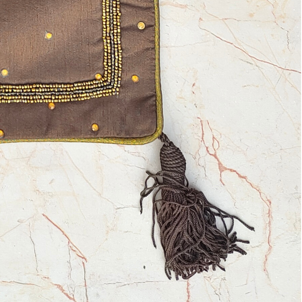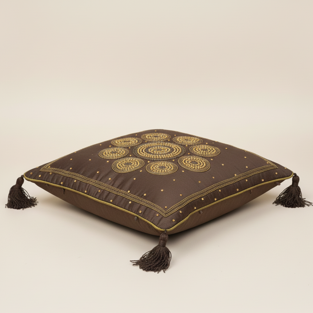 Add depth, warmth, and regal elegance to your interiors with this exquisitely handcrafted brown cushion cover. Featuring an ornate circular mandala-style embroidery in rich golden tones, the design reflects traditional artistry with a refined, luxurious appeal. The deep brown base enhances the intricate detailing, while handcrafted tassels on all four corners add a classic, festive charm.