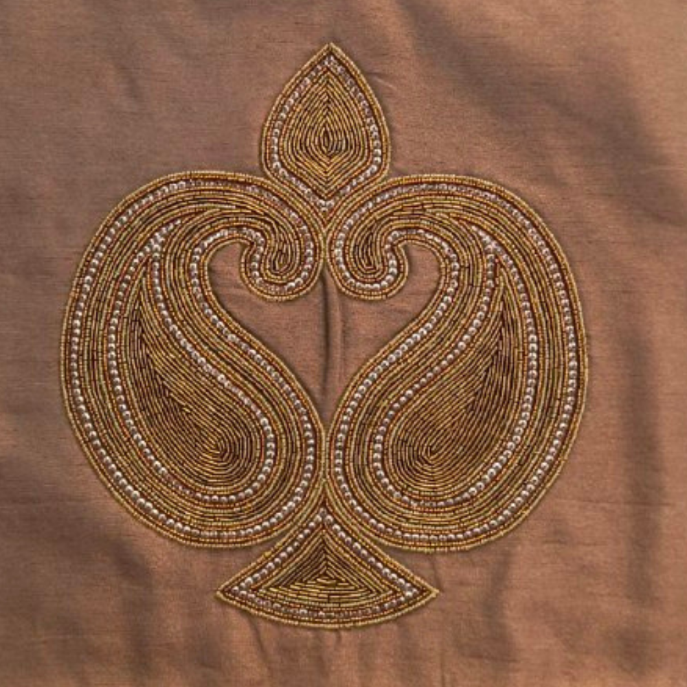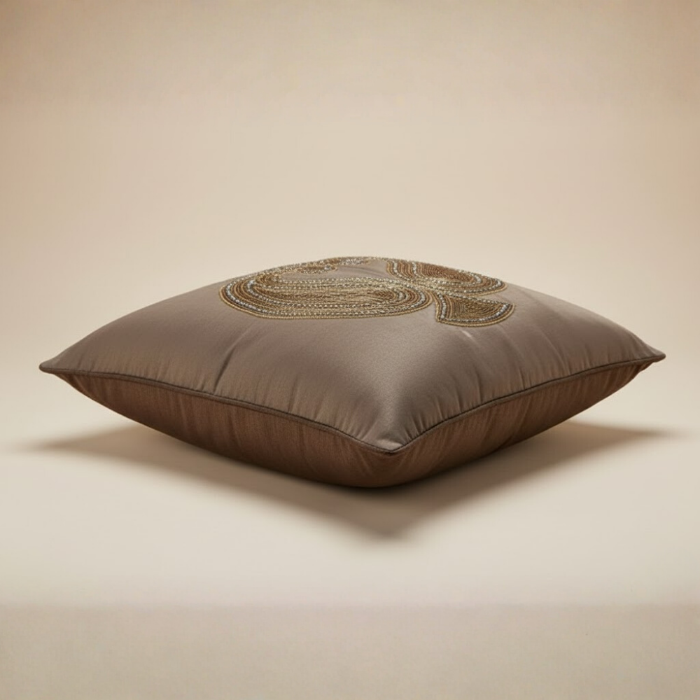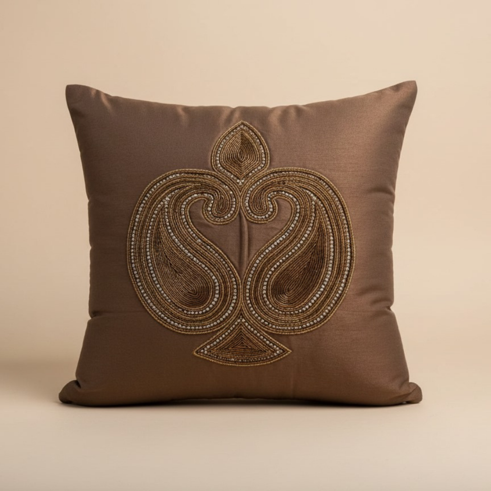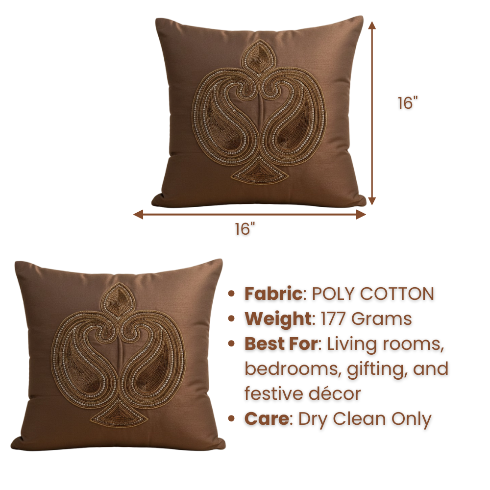 Enhance your home décor with this elegant handcrafted brown cushion cover, featuring a beautifully detailed traditional embroidered motif. The deep brown base pairs harmoniously with golden-brown threadwork, creating a rich, luxurious design that adds warmth and sophistication to any space.