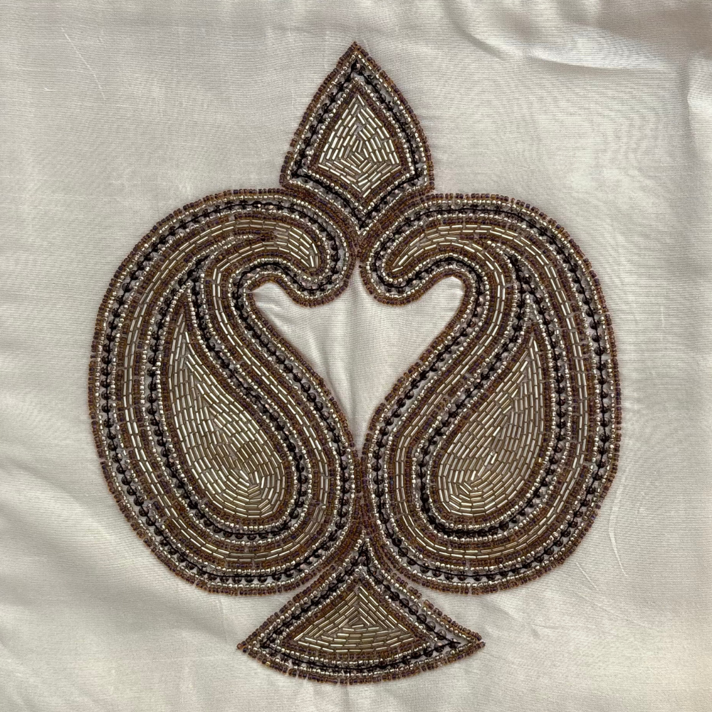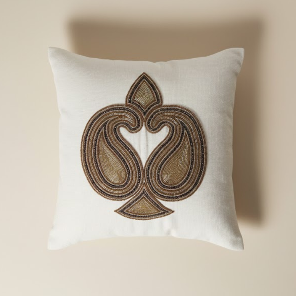 Add a touch of timeless elegance to your décor with this handcrafted cream cushion cover, beautifully designed with an intricate paisley-inspired embellished pattern. The soft cream base enhances the rich golden-brown detailing, creating a luxurious and refined look suitable for any interior style.