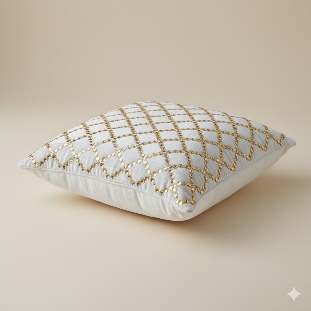 Bring regal charm to your interiors with this handcrafted cream cushion cover, designed to add a soft yet luxurious glow to sofas, beds, and accent chairs. The warm cream base is richly adorned with an all-over diamond lattice created using shimmering gold-toned sequins, giving the cushion a glamorous, festive look that still feels elegant and refined.