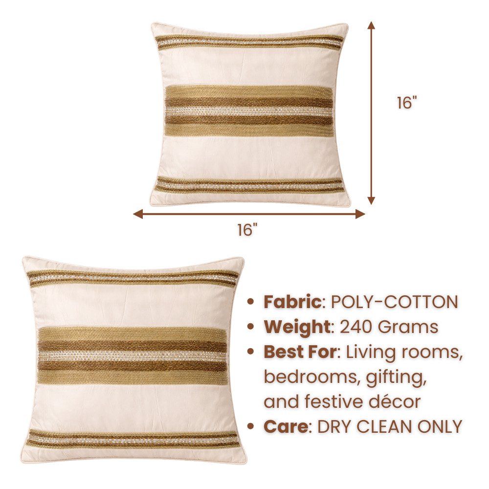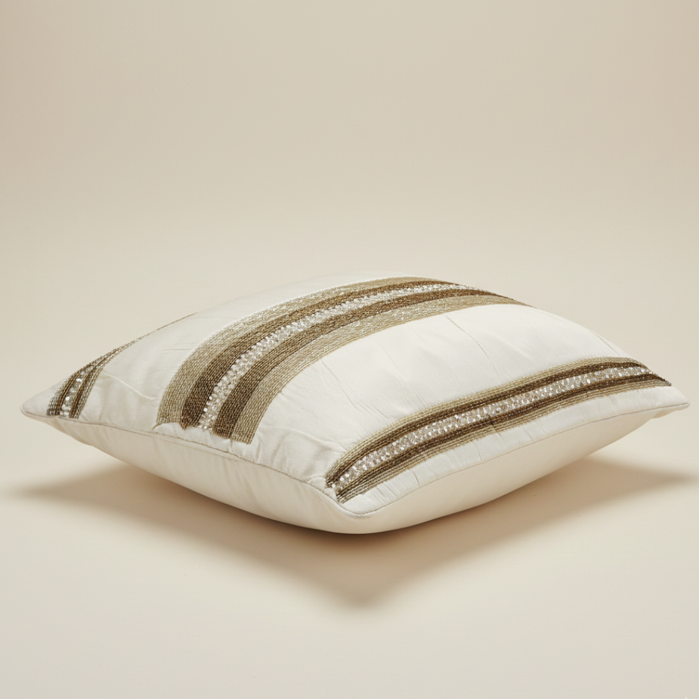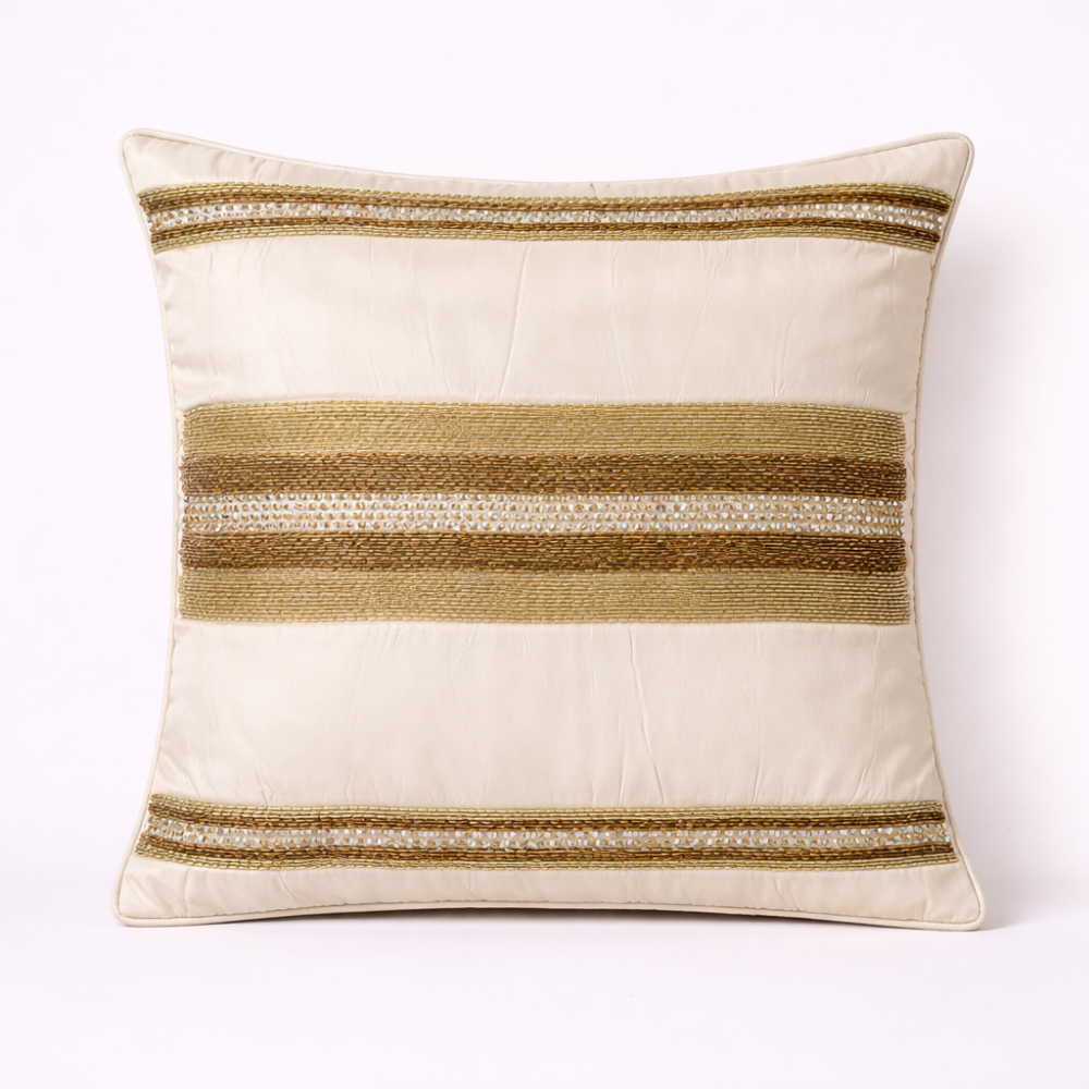 Bring soft sophistication and timeless elegance to your home décor with this handcrafted cream cushion cover, beautifully detailed with refined horizontal striped embellishments. The warm cream base is enriched with subtle metallic-toned woven bands, creating a graceful balance of texture, shine, and understated luxury.
