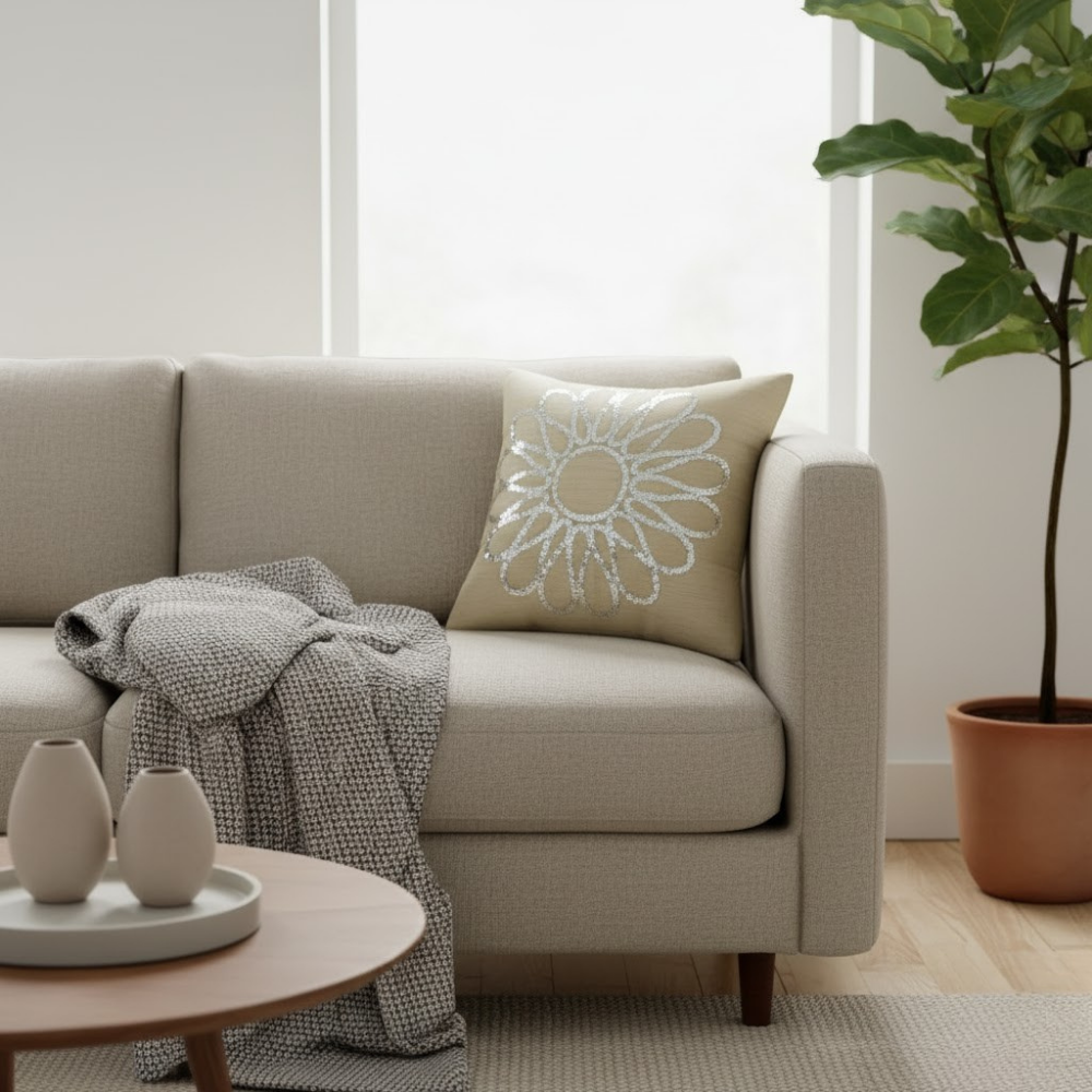 Bring timeless elegance and soft sophistication to your home with this handcrafted beige floral cushion cover, beautifully made from premium poly cotton for a smooth, durable, and refined finish. The subtle floral detailing adds an artistic touch, creating a perfect balance of simplicity and grace.