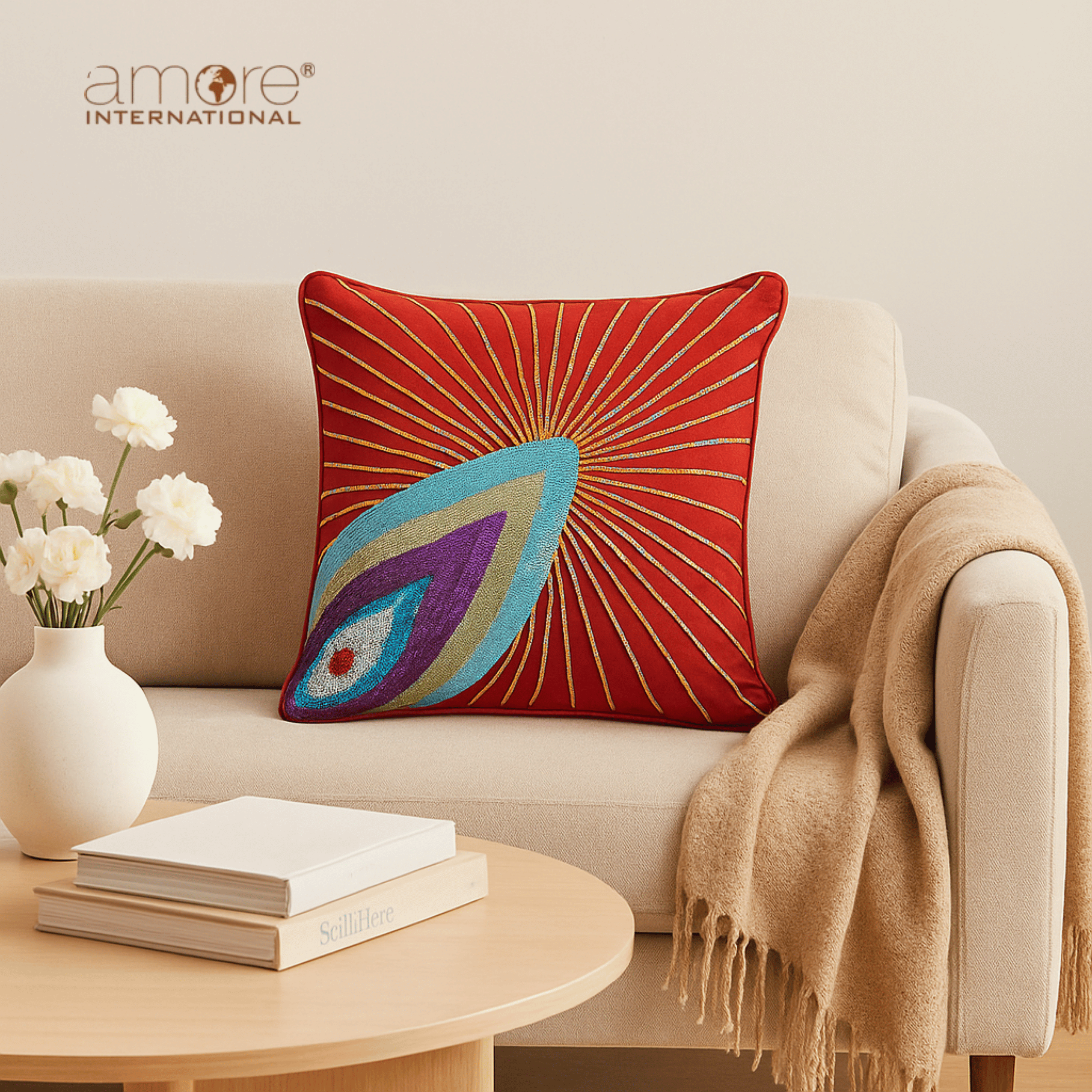 Enhance your interiors with this handcrafted red cushion cover, beautifully adorned with a radiant peacock-feather inspired design. Made with a premium polyester and cotton blend, it offers both durability and a soft finish. The striking red base is elevated with multicolor sequins and thread embroidery in shades of blue, green, purple, and metallic highlights, making it a perfect blend of vibrancy and sophistication. With its 16"x16" size, this cushion cover is ideal for sofas, beds, and lounge décor. Weighing approximately 140–180 grams, it is lightweight, easy to use, and long-lasting. For best maintenance, dry clean only to preserve its handcrafted detailing and shine.