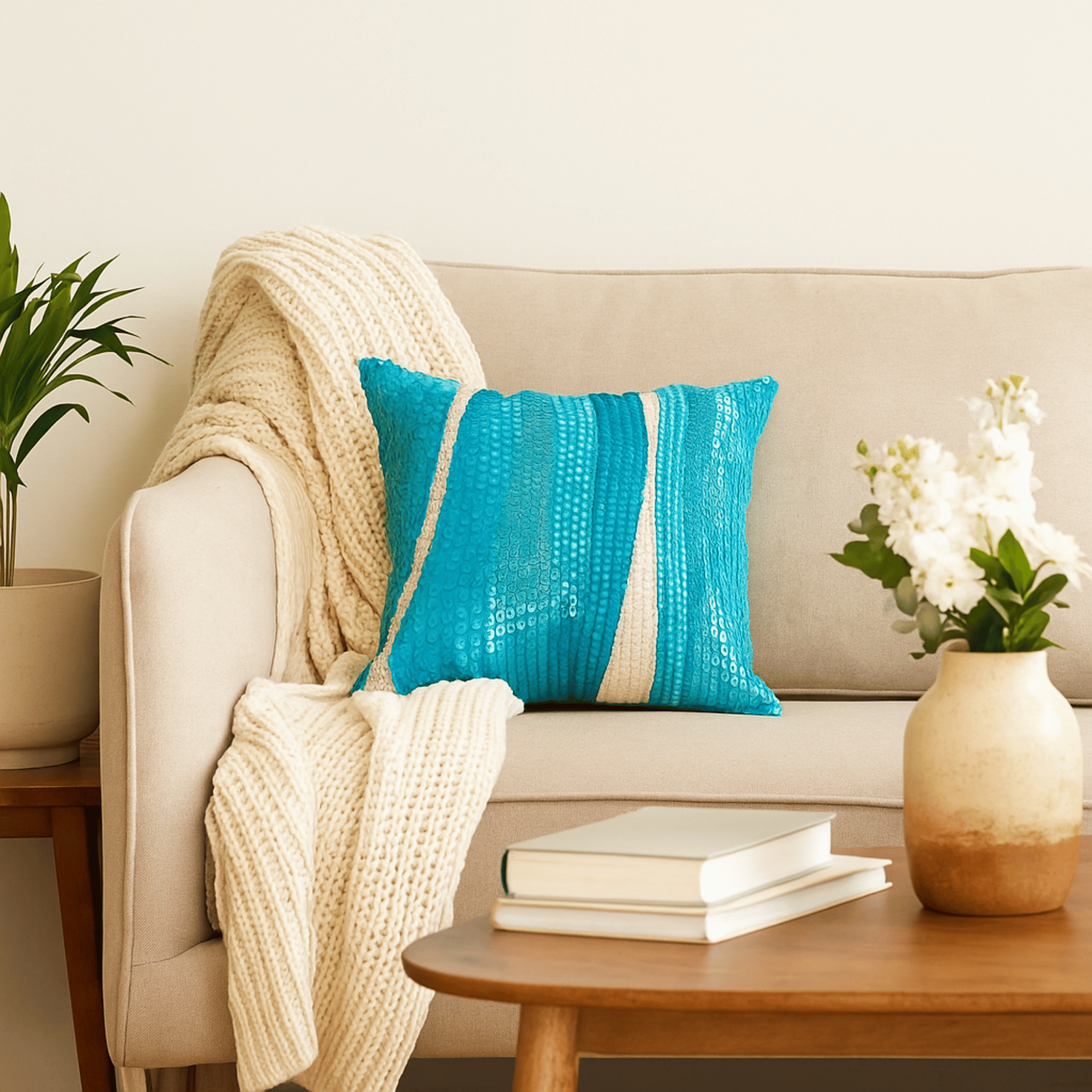 Elevate your décor with this handcrafted cushion cover, made from premium Poly cotton for a rich and textured appeal. Designed in a vibrant turquoise shade, it adds a refreshing pop of color to any space while maintaining a soft, elegant feel. With a weight of 125 grams, it strikes the right balance between sturdiness and comfort. Perfect for sofas, chairs, or beds, this cushion cover complements both modern and traditional interiors. To maintain its luxurious finish and long-lasting quality, it is best kept with dry clean only care.