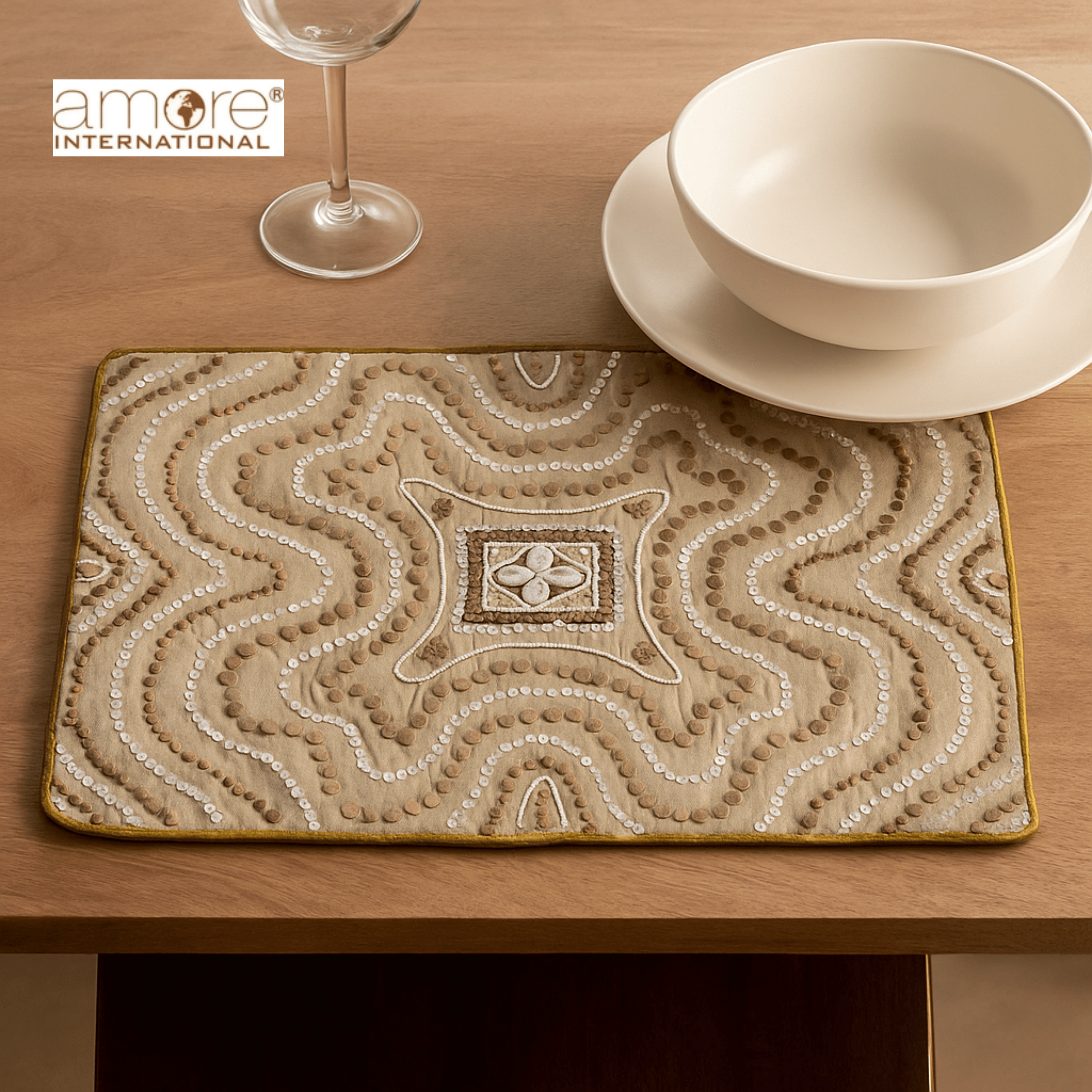Add a refined charm to your dining table with this handcrafted beige placemat, beautifully designed with intricate embroidery and elegant stitched waves. Crafted from poly-cotton fabric, it offers a balance of softness and durability, making it perfect for both everyday use and festive settings. With a lightweight design of 90 grams, it’s easy to handle yet feels premium. The central embroidered motif adds an artistic touch, enhancing the beauty of your dining décor. Best maintained with dry cleaning, this placemat ensures lasting elegance.