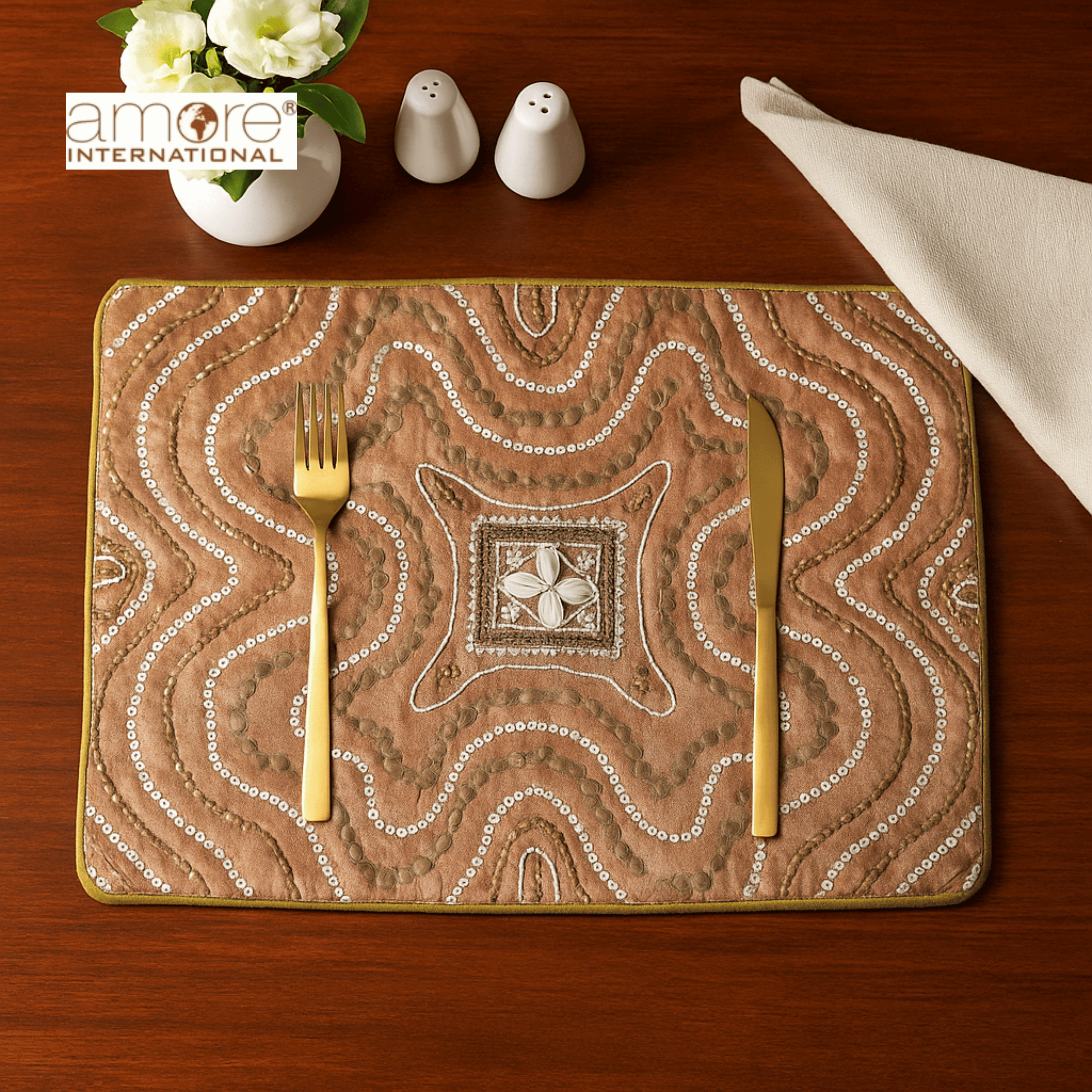Enhance your dining experience with this handcrafted bronze placemat, featuring elegant embroidery and artistic stitched patterns. Made from a premium poly-cotton blend, it combines durability with refined style. The central embroidered motif and wavy detailing create a luxurious look, perfect for festive dining and special occasions. With a light weight of 90 grams, it adds charm without being bulky. Designed for sophistication and long-lasting use, this placemat is best maintained with dry cleaning to preserve its artistry.