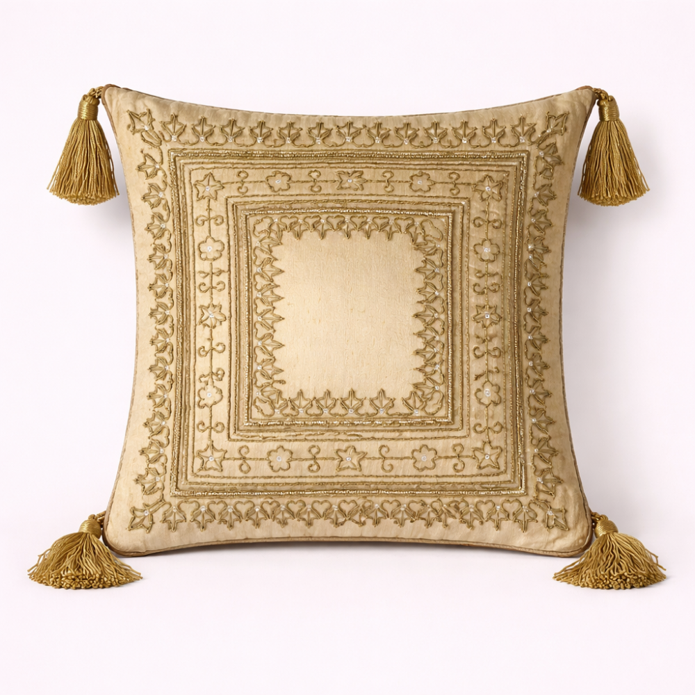Add timeless elegance and subtle luxury to your home décor with this handcrafted golden cushion cover, beautifully detailed with intricate square embroidery inspired by traditional motifs. The soft golden base is enhanced with finely stitched patterns in matching tones, creating a rich yet understated look that complements both classic and contemporary interiors.