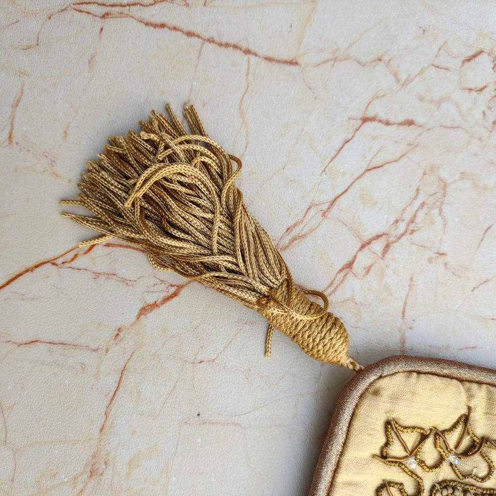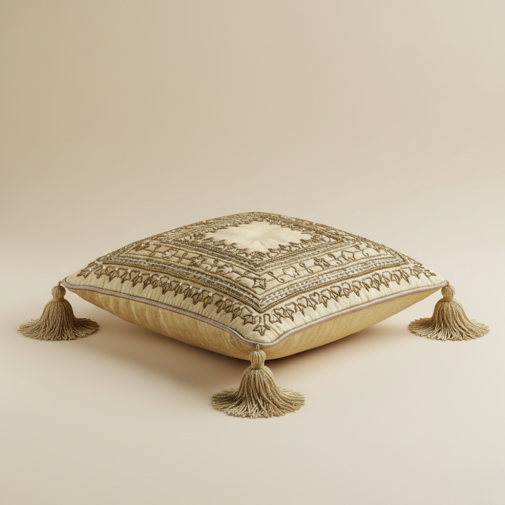 The detailed handcrafted embroidery adds refined texture and depth, while matching golden tassels on all four corners lend a graceful festive finish. Its compact 12"x12" size makes it ideal for accenting sofas, armchairs, beds, or decorative corners, bringing warmth and sophistication to any space.