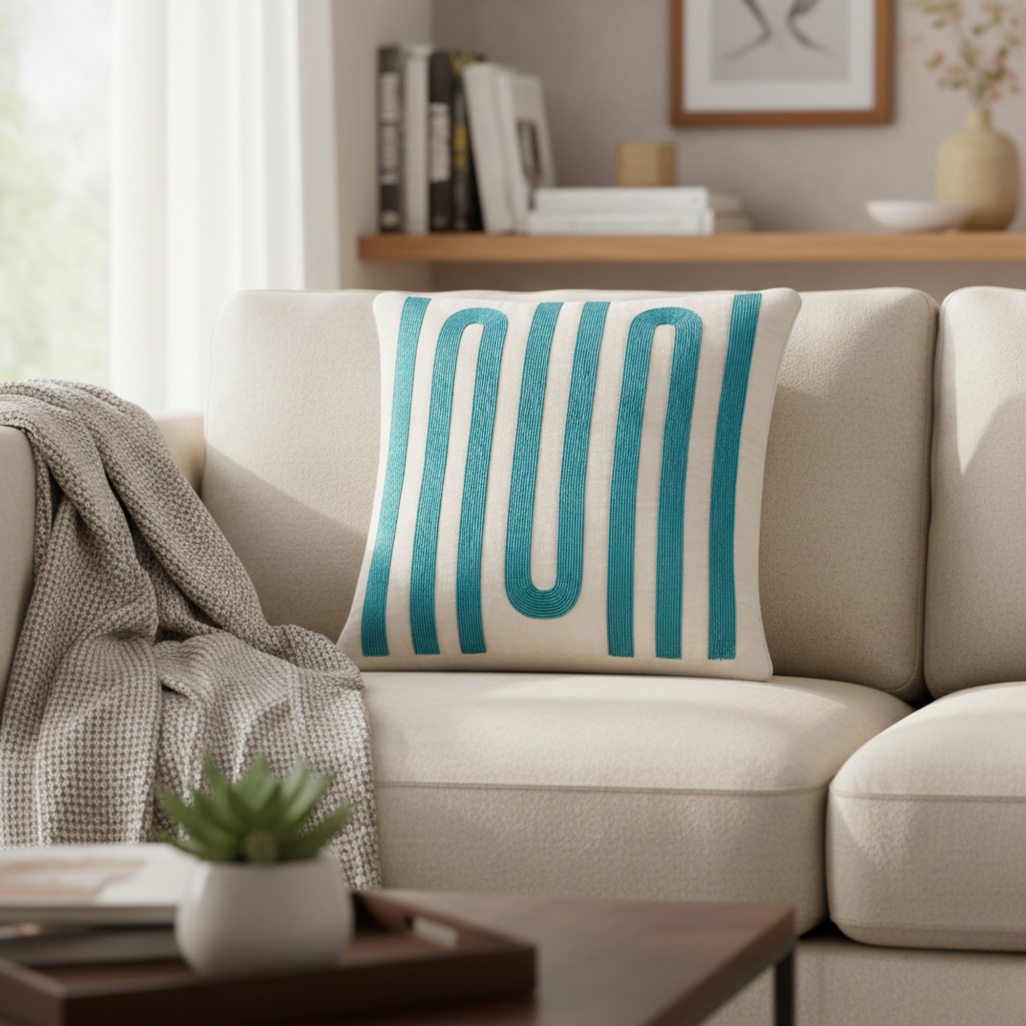 The structured linear embroidery adds texture and visual rhythm, making this cushion cover an excellent choice for modern, coastal, minimal, and cheerful interiors. Its compact 12"x12" size makes it ideal for sofas, beds, accent chairs, or cozy corners—whether styled as a statement piece or layered with neutral décor.