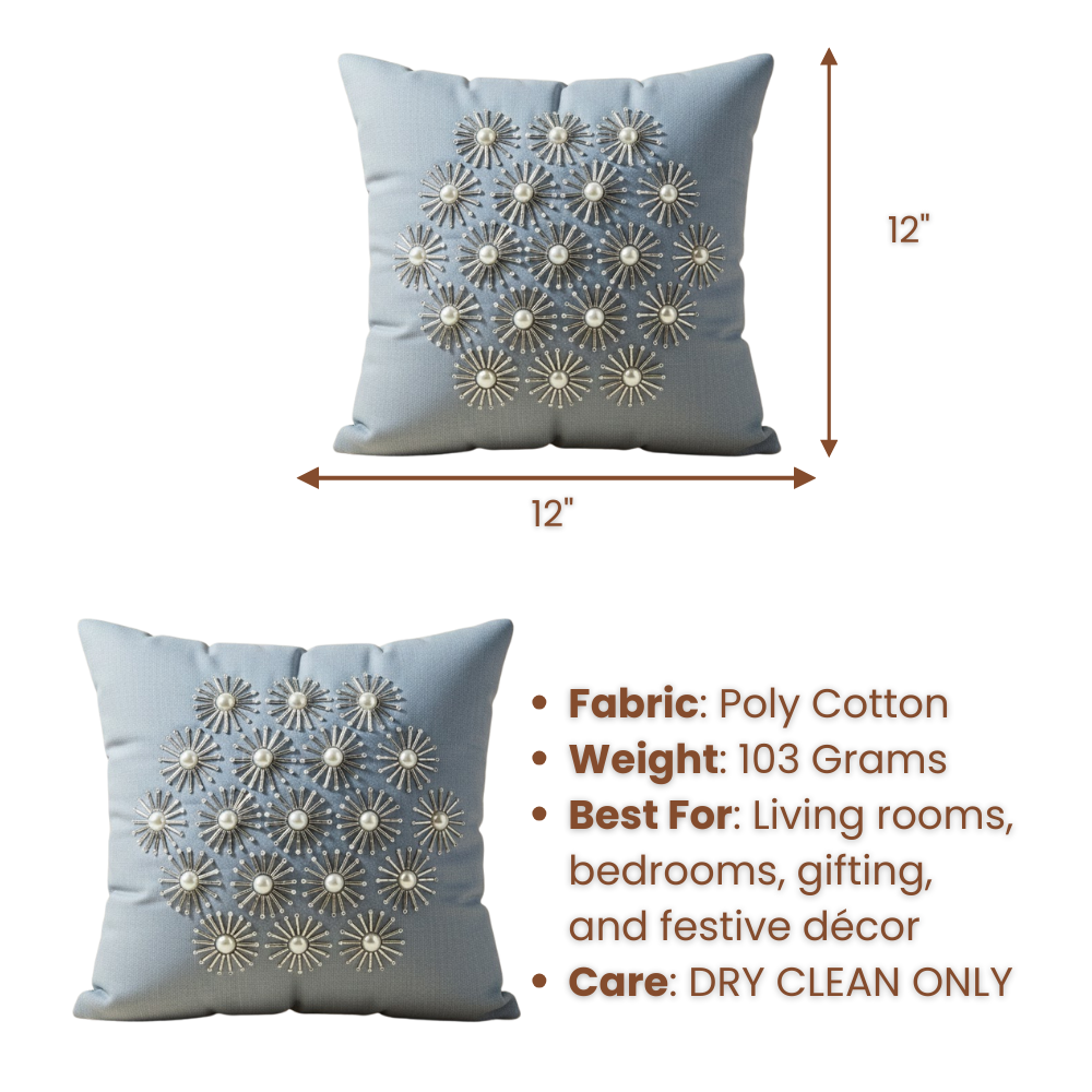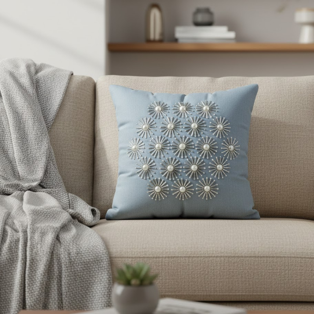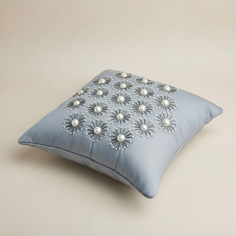 Introduce soft sophistication to your décor with this handcrafted grey cushion cover, designed to blend seamlessly with modern, minimal, and classic interiors. The gentle grey base is enhanced with intricate 3D floral motifs featuring bead-style centers, creating a refined textured look that adds depth and elegance to sofas, beds, and accent chairs.