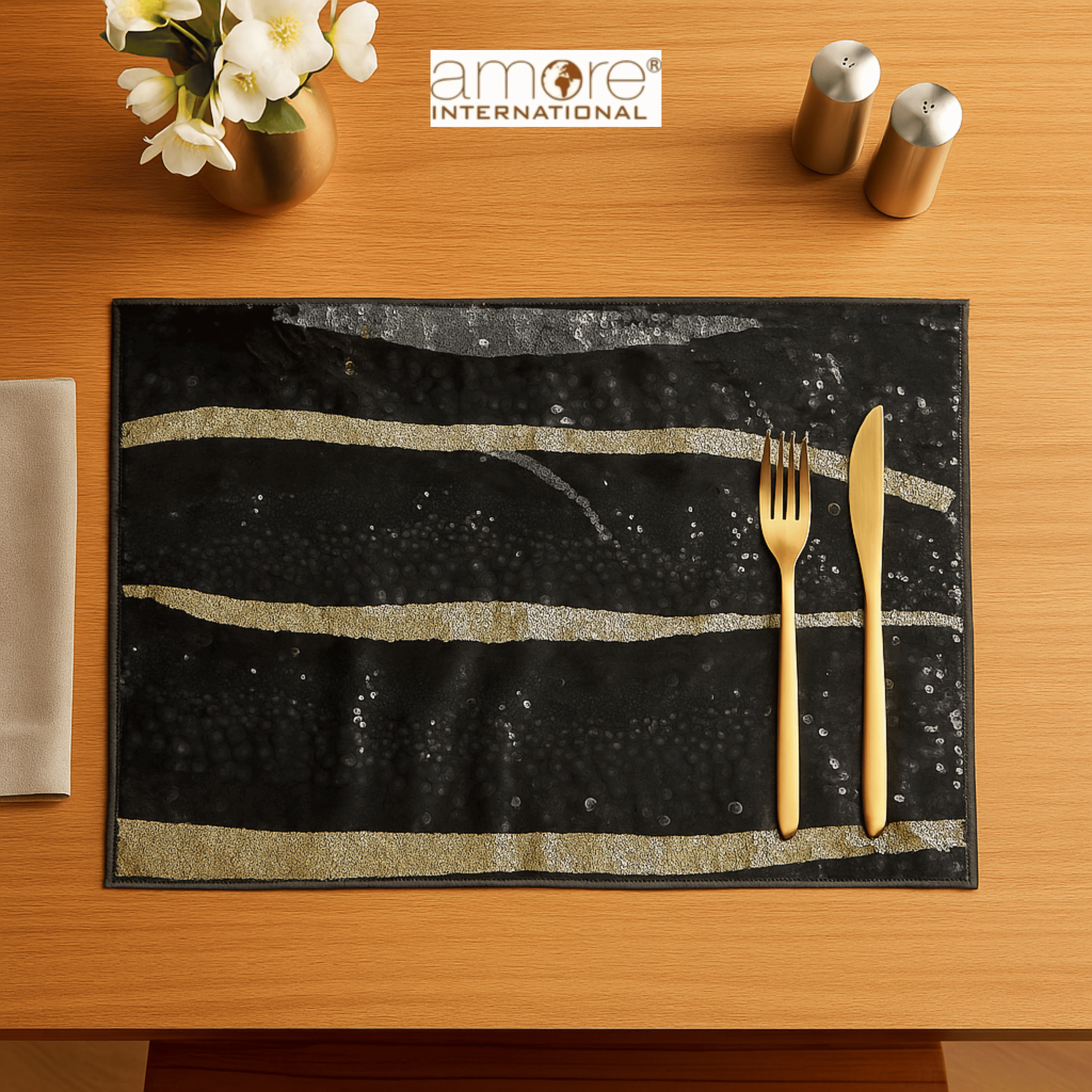 Bring timeless sophistication to your dining table with this handcrafted black placemat, designed with lamination for extra durability. Made from poly-cotton fabric, it offers a perfect blend of strength and elegance, making it ideal for both everyday meals and formal settings. With a sturdy weight of 200 grams, it provides a premium, well-structured feel that enhances any table setup. The bold black color adds a modern, classy touch, pairing beautifully with all types of dinnerware. For best results, this placemat should be maintained with spot cleaning to ensure long-lasting use.