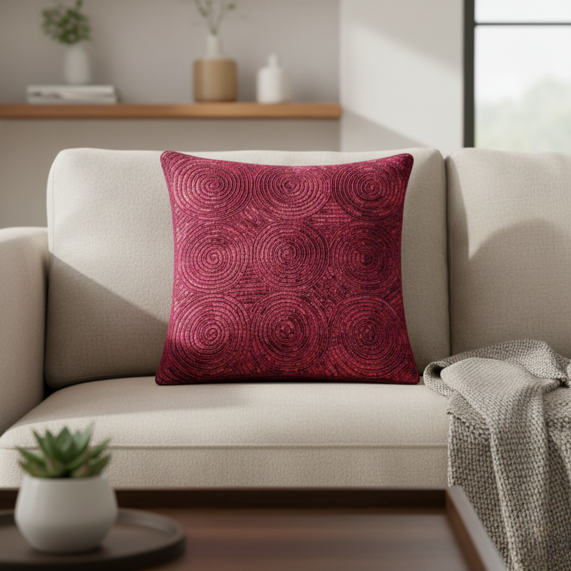 Add a bold touch of elegance and warmth to your home décor with this handcrafted maroon cushion cover, beautifully detailed with intricate circular embroidered swirl patterns. The deep maroon hue brings a rich, luxurious feel, while the concentric textured design adds depth, character, and a refined handcrafted finish.