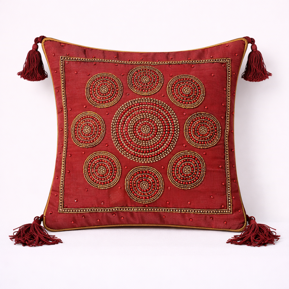 Bring timeless richness and festive elegance into your home décor with this handcrafted maroon cushion cover, beautifully adorned with intricate circular embroidered motifs. The deep maroon base is enhanced with detailed golden and earthy embroidery, creating a regal, traditional look that blends effortlessly with both classic and contemporary interiors.