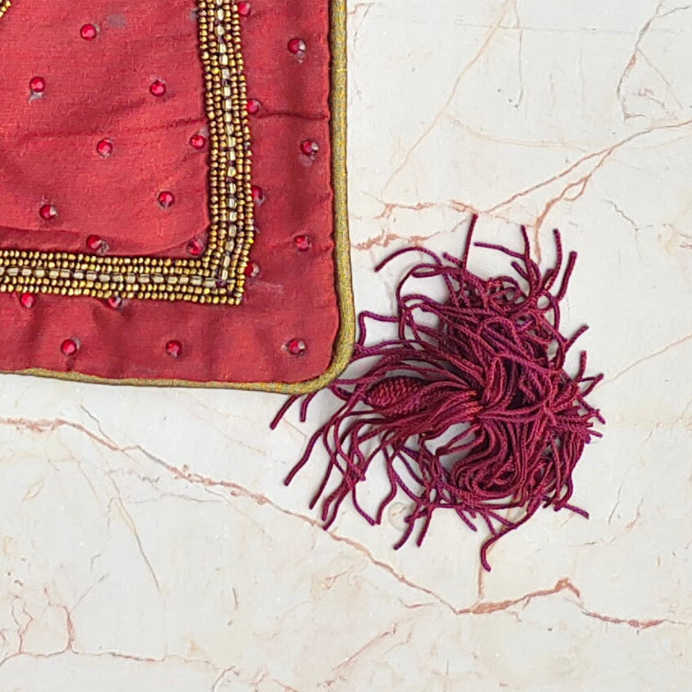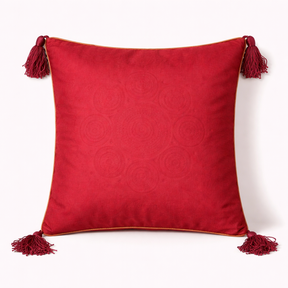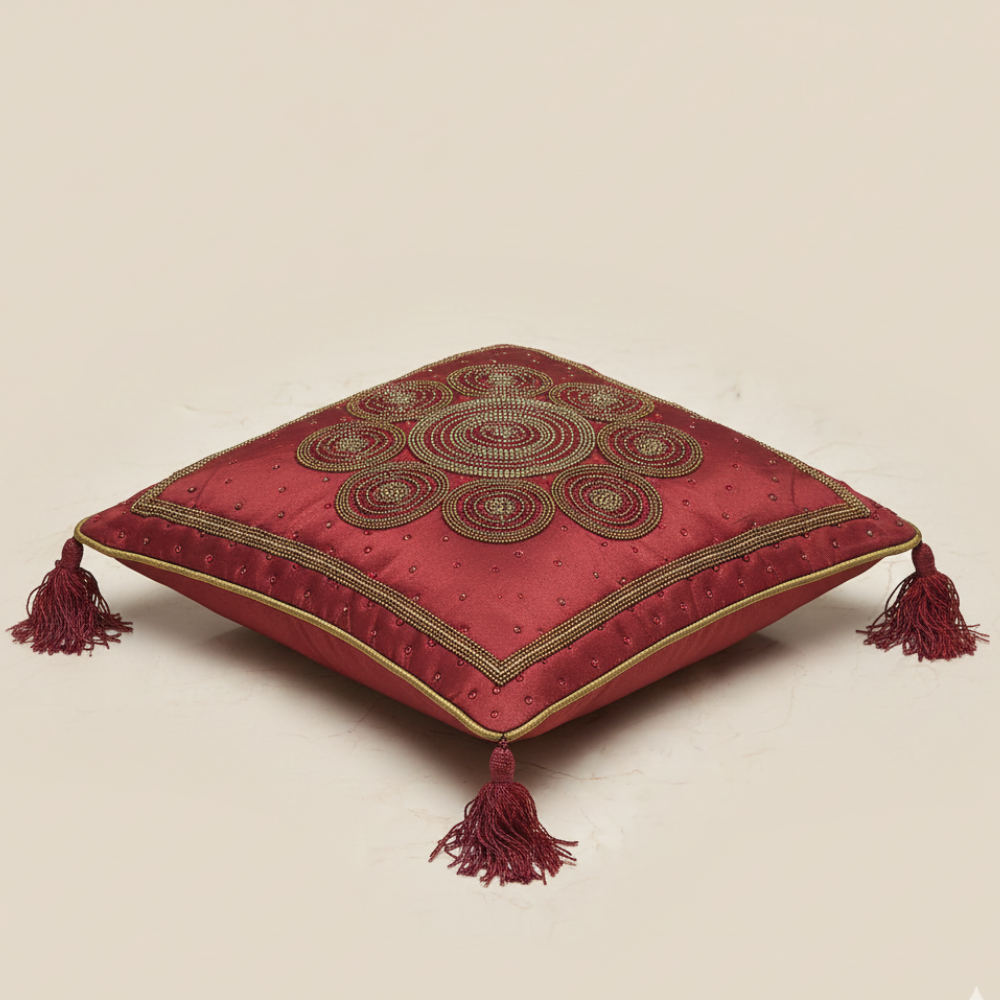 The finely handcrafted embroidery adds texture and depth, while matching maroon tassels on all four corners provide a luxurious decorative finish. Its compact 12"x12" size makes it ideal for styling sofas, armchairs, beds, or accent corners, instantly elevating the ambiance of any space.
