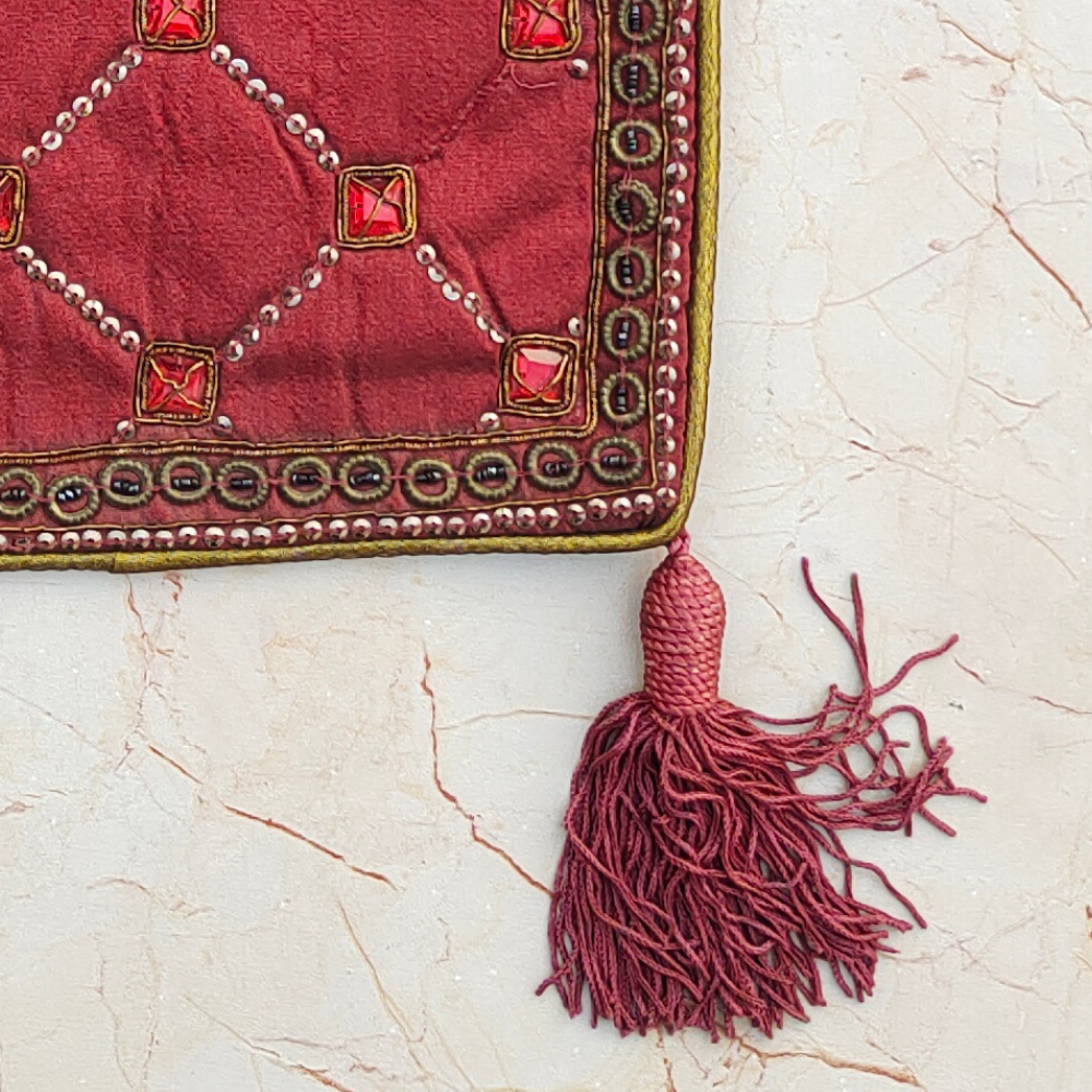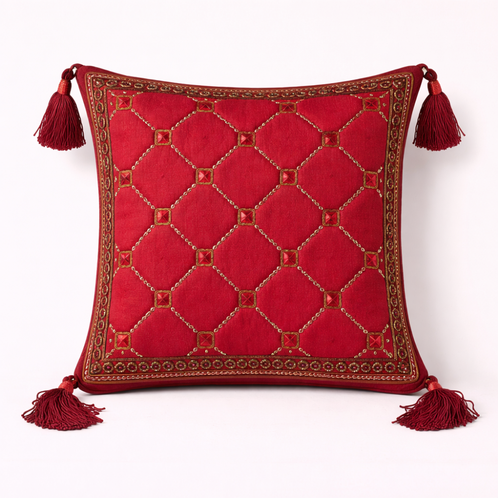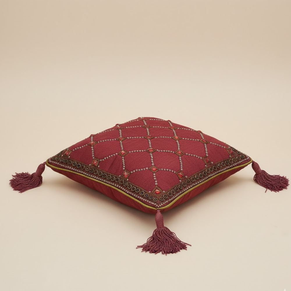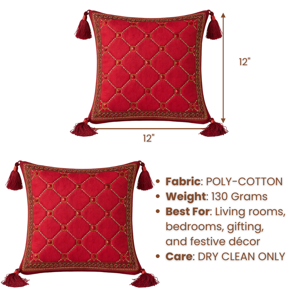 The finely handcrafted quilting adds texture and depth, while matching maroon tassels on all four corners lend a festive and decorative finish. Its compact 12"x12" size makes it ideal for styling sofas, accent chairs, beds, or decorative corners, adding a touch of timeless elegance to any space.