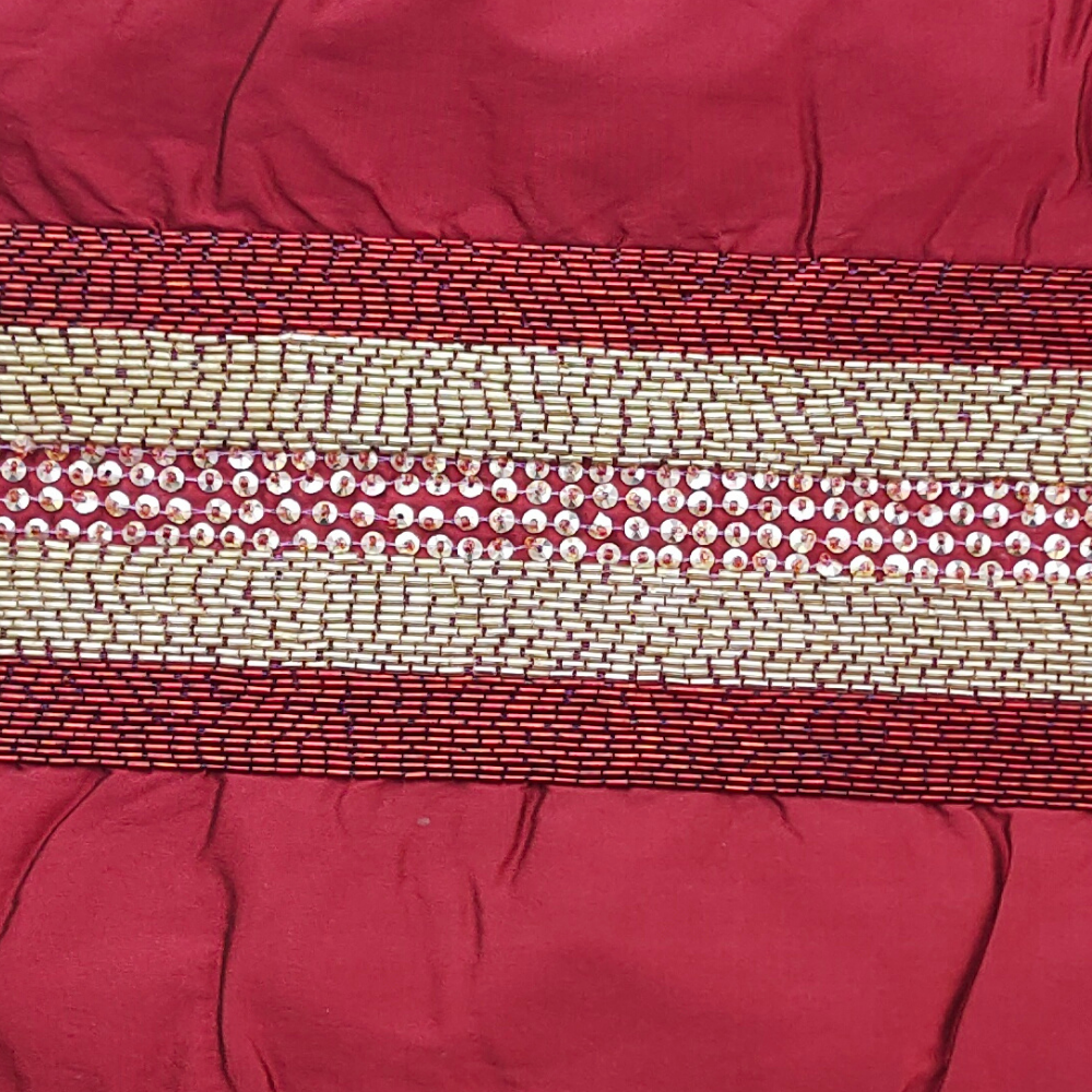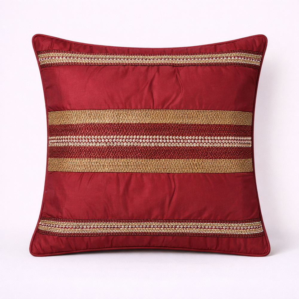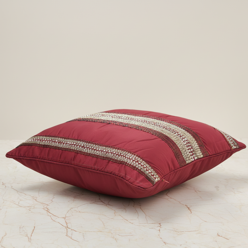 Add rich warmth and festive sophistication to your home décor with this handcrafted maroon cushion cover, beautifully detailed with elegant horizontal striped embellishments. The deep maroon base is accentuated with finely woven metallic-toned bands, creating a luxurious yet balanced look that instantly elevates any space.