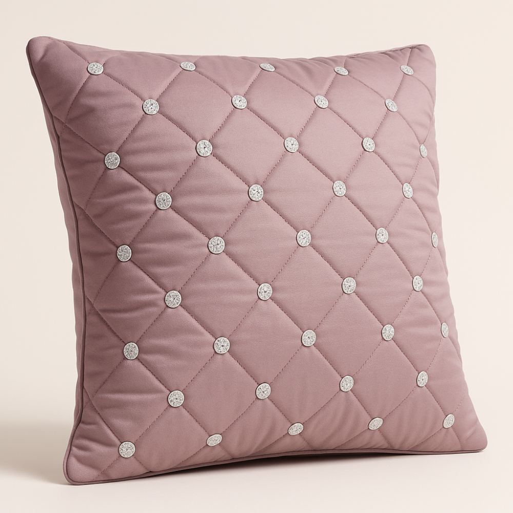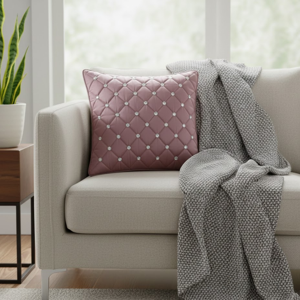 Add soft elegance and modern luxury to your home décor with this beautifully handcrafted mauve cushion cover. The soothing mauve shade brings a calm yet sophisticated charm, while the finely stitched diamond-quilted pattern is enhanced with shimmering crystal studs, creating a graceful balance of softness and sparkle.
